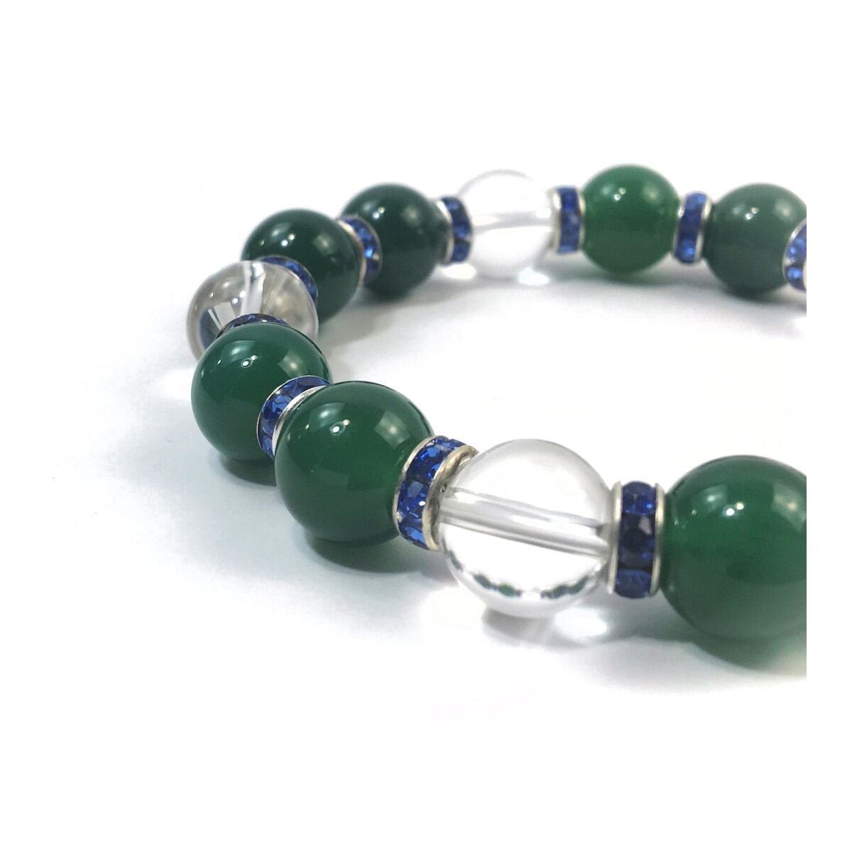 こちらは、緑瑪瑙と水晶を組み合わせたパワーストーンブレスレットです。間にはロンデルを挟み高級感あるデザインに仕上げております。石大きさは12mm玉を使用して内周約18cmです。気になる方は是非この機会にどうぞ。