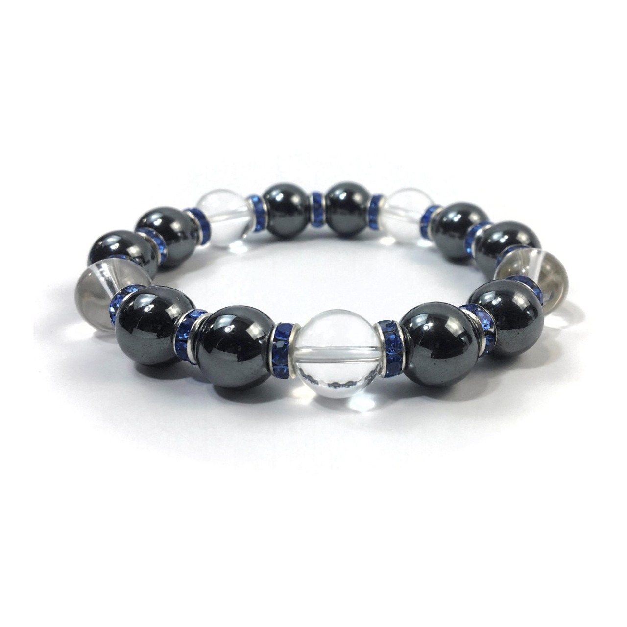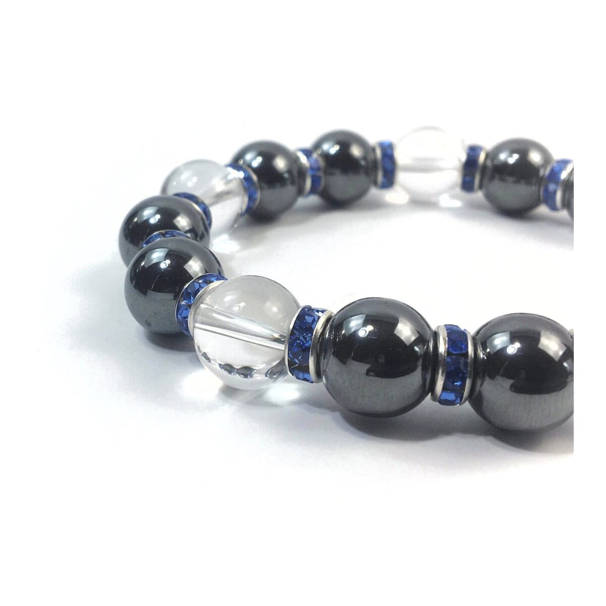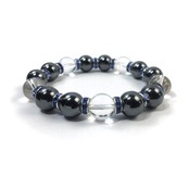 こちらは、ヘマタイトと水晶を組み合わせたパワーストーンブレスレットです。間にはロンデルを挟み高級感あるデザインに仕上げております。石大きさは12mm玉を使用して内周約18cmです。気になる方は是非この機会にどうぞ。
