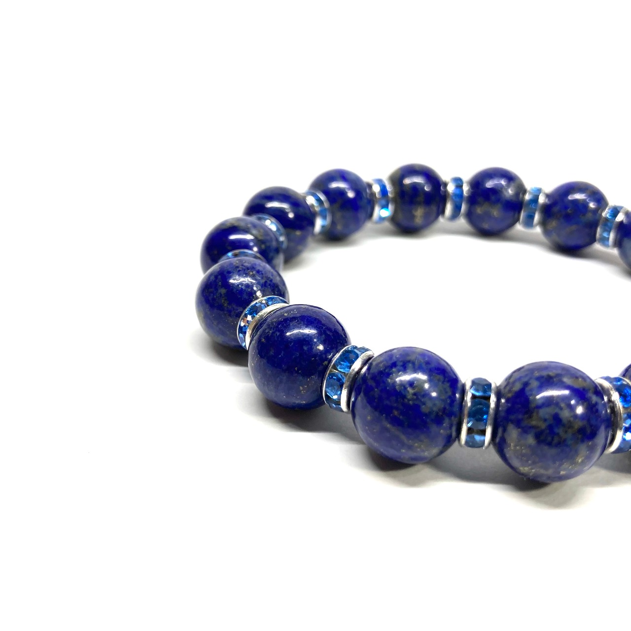 こちらは、12mm玉のラピスラズリを使用したブレスレットです。石との間にはロンデルを挟み高級感を演出しています。シンプルなデザインですのでどんなコーディネートとも合わせ易いブレスレットです。石大きさは12mm玉です。内周約18cmです。数に限りがございますので気になる方はお早めにどうぞ。