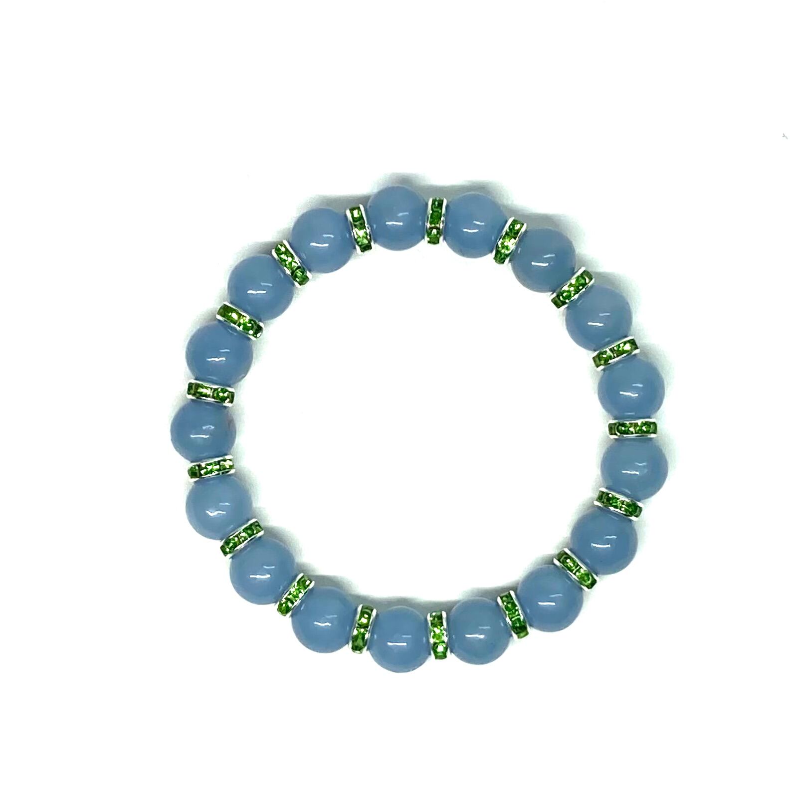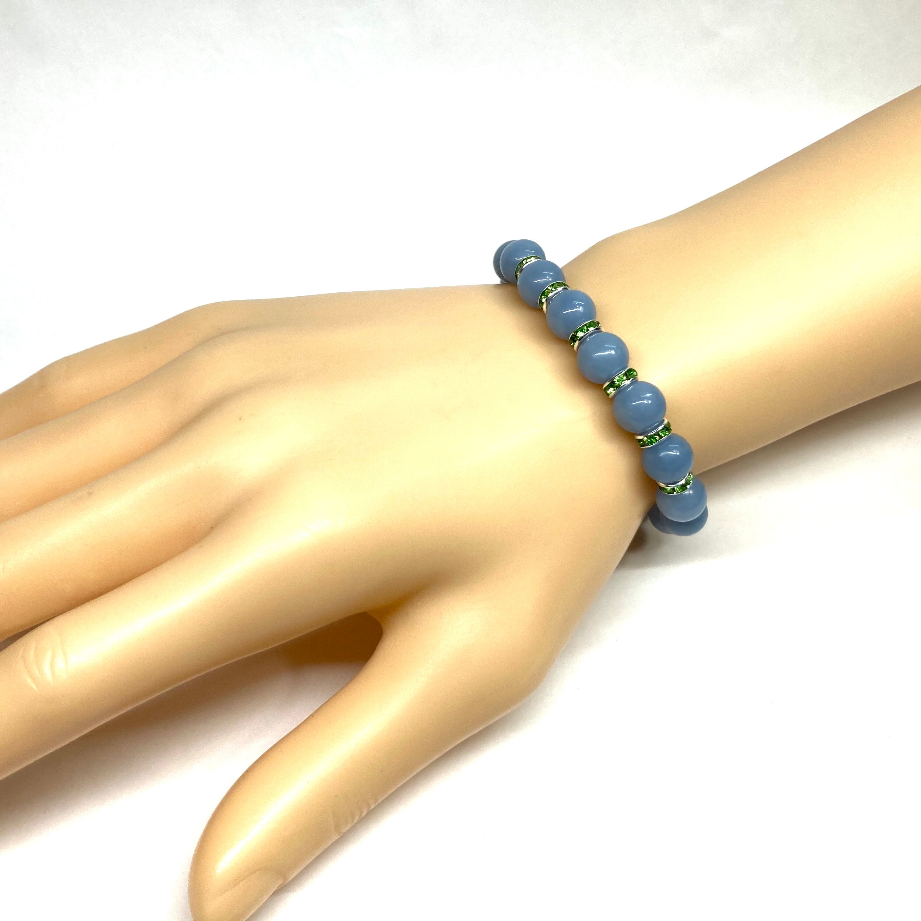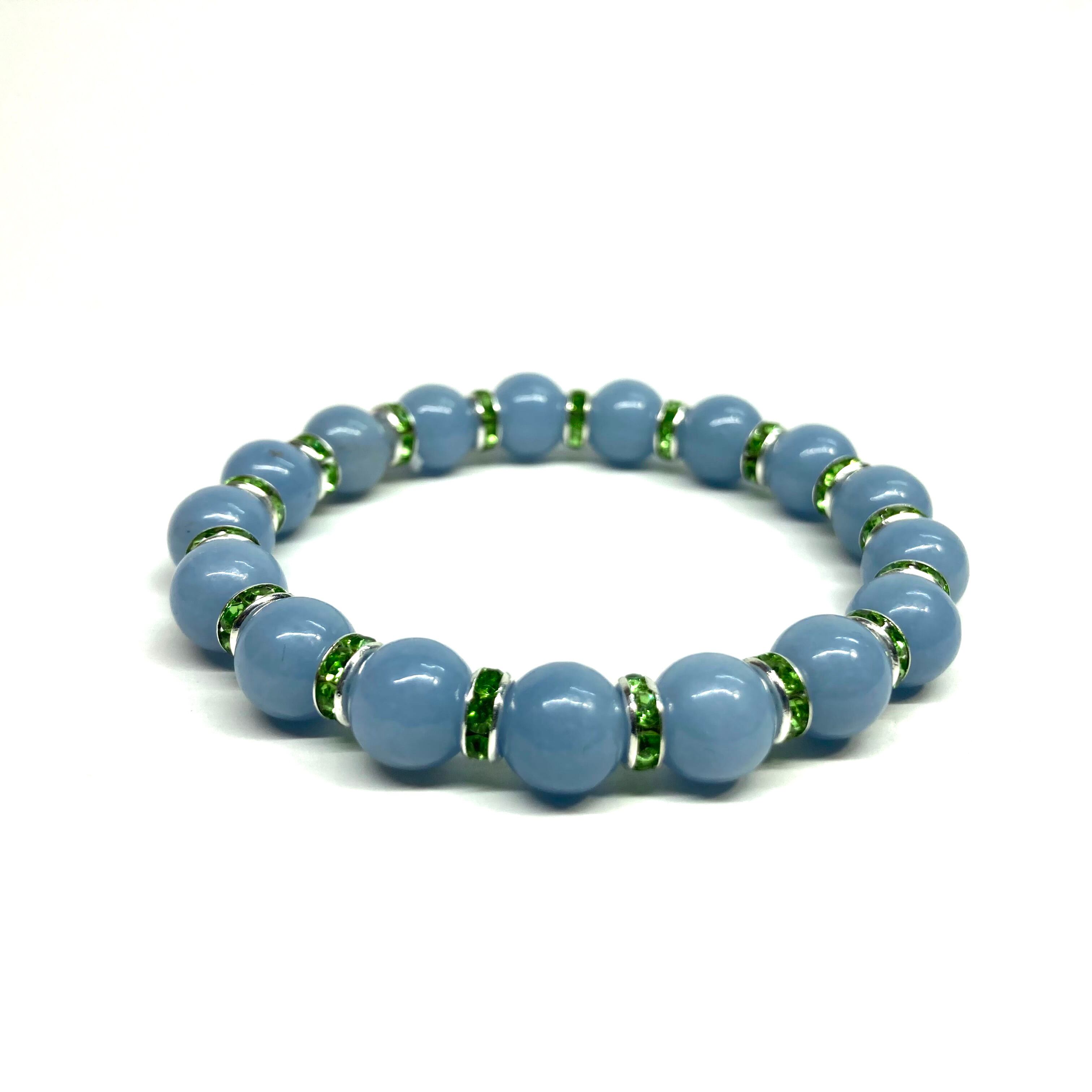こちらは、エンジェライトの8mm玉を使用したパワーストーンブレスレットです。石との間にはロンデルを挟み高級感を演出しております。シンプルなデザインは、シーン問わずどんなコーディネートとも合わせ易いブレスレットです。サイズは内周約21cm (手首周りを測り少し余裕をもってお買い求めくださいませ。)です。当社の中でも一番人気の実績があるデザインとなっております。気になる方はお早めにどうぞ。