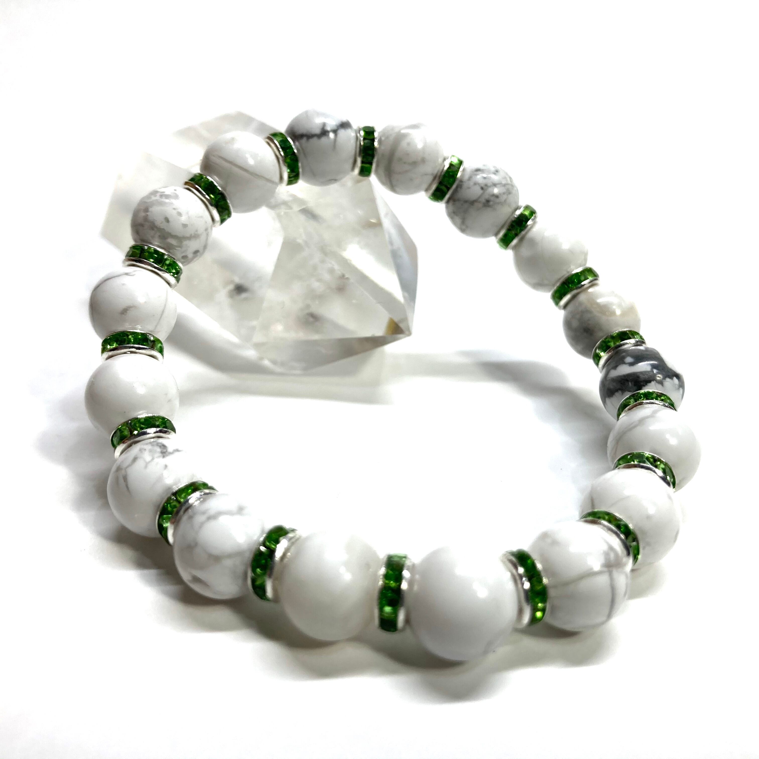 こちらは、ハウライトの8mm玉を使用したパワーストーンブレスレットです。石との間にはロンデルを挟み高級感を演出しております。シンプルなデザインは、シーン問わずどんなコーディネートとも合わせ易いブレスレットです。サイズは内周約19cm (手首周りを測り少し余裕をもってお買い求めくださいませ。)です。当社の中でも一番人気の実績があるデザインとなっております。気になる方はお早めにどうぞ。