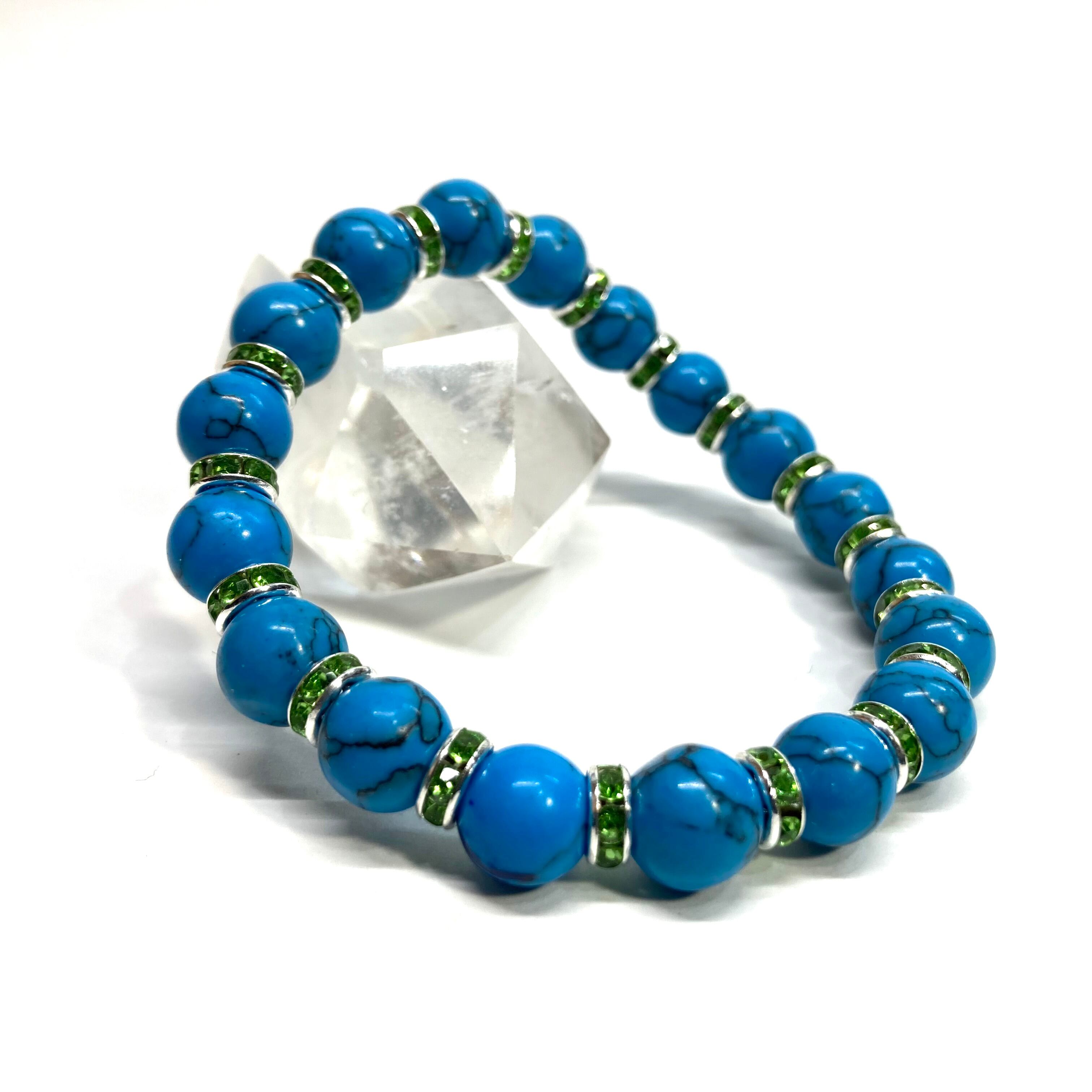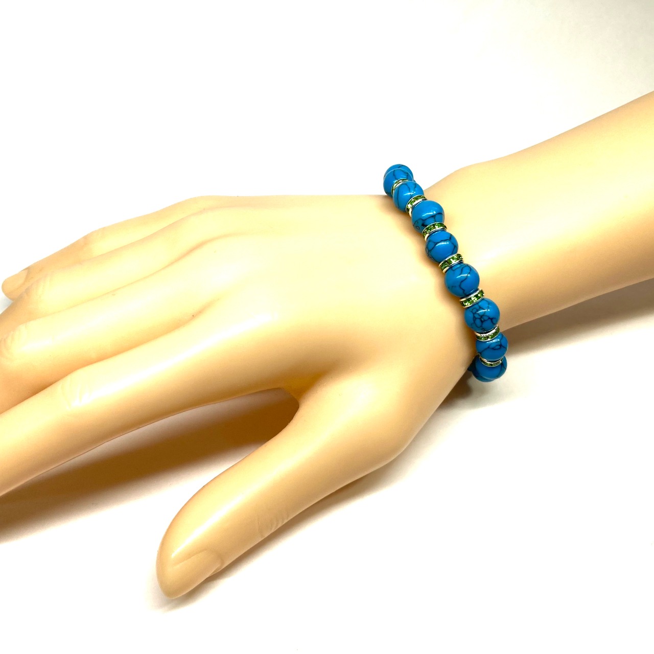 こちらは、ターコイズの8mm玉を使用したパワーストーンブレスレットです。石との間にはロンデルを挟み高級感を演出しております。シンプルなデザインは、シーン問わずどんなコーディネートとも合わせ易いブレスレットです。サイズは内周約19cm (手首周りを測り少し余裕をもってお買い求めくださいませ。)です。当社の中でも一番人気の実績があるデザインとなっております。気になる方はお早めにどうぞ。