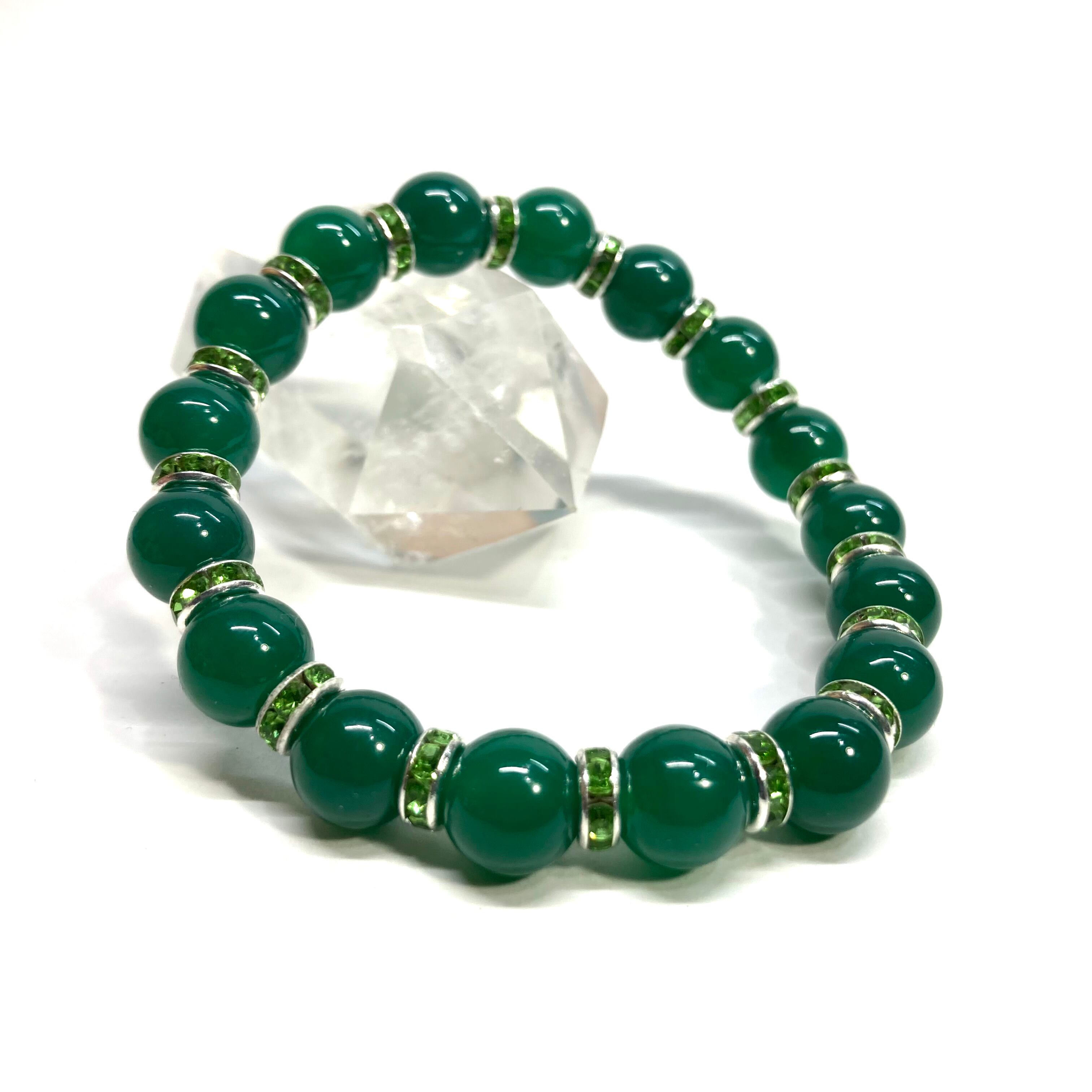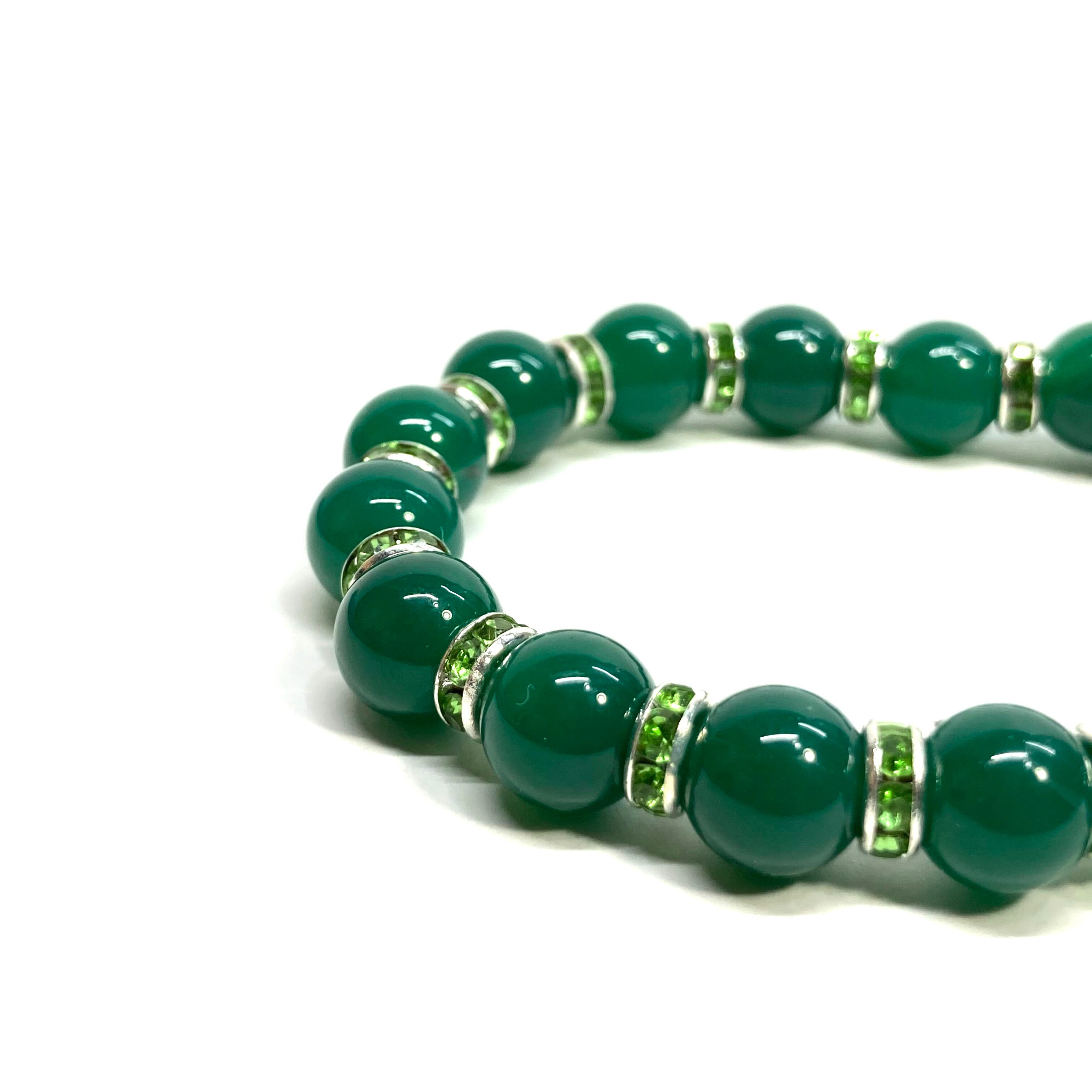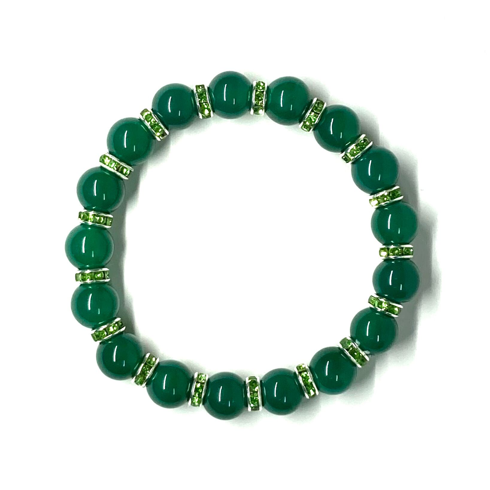 こちらは、緑瑪瑙の8mm玉を使用したパワーストーンブレスレットです。石との間にはロンデルを挟み高級感を演出しております。シンプルなデザインは、シーン問わずどんなコーディネートとも合わせ易いブレスレットです。サイズは内周約19cm (手首周りを測り少し余裕をもってお買い求めくださいませ。)です。当社の中でも一番人気の実績があるデザインとなっております。気になる方はお早めにどうぞ。
