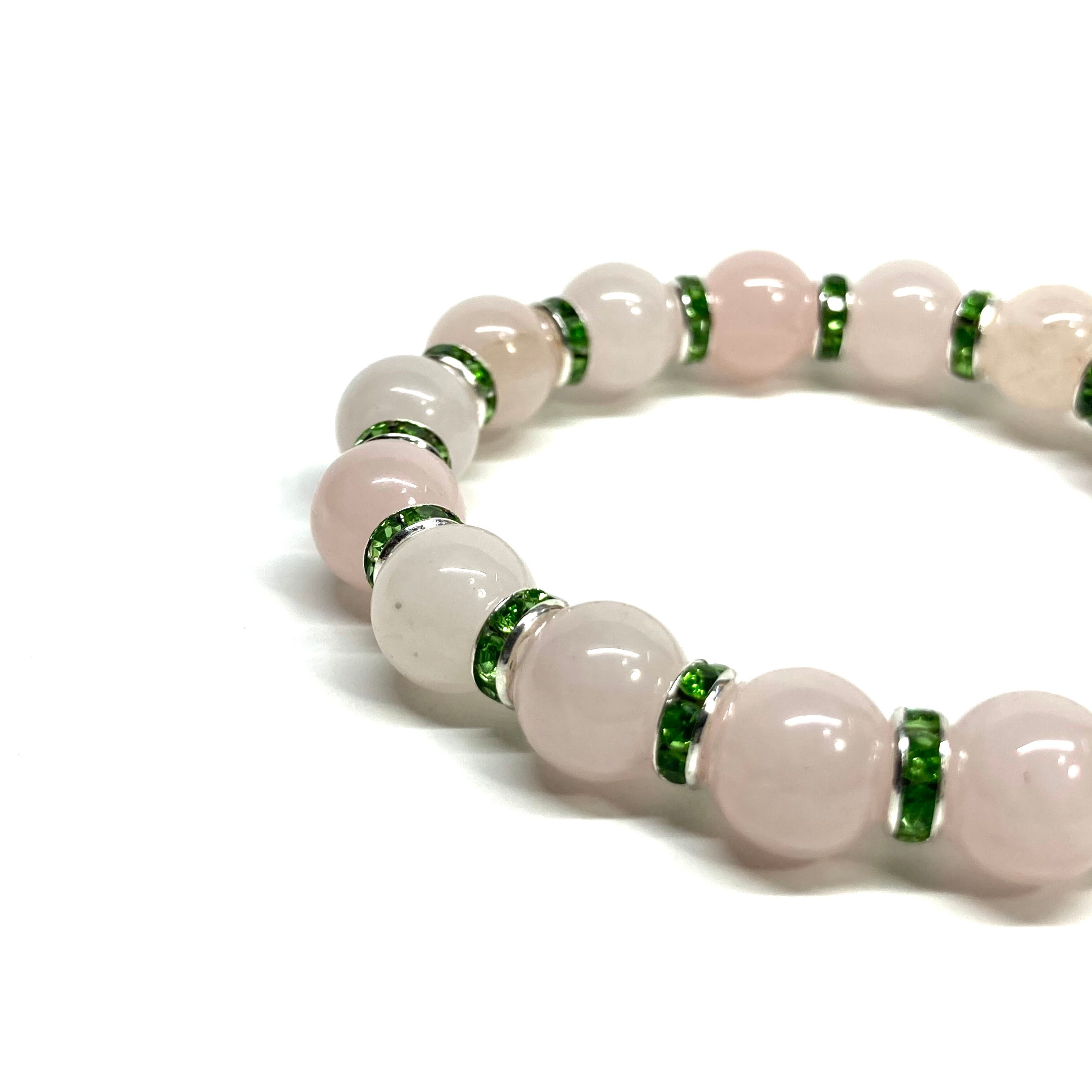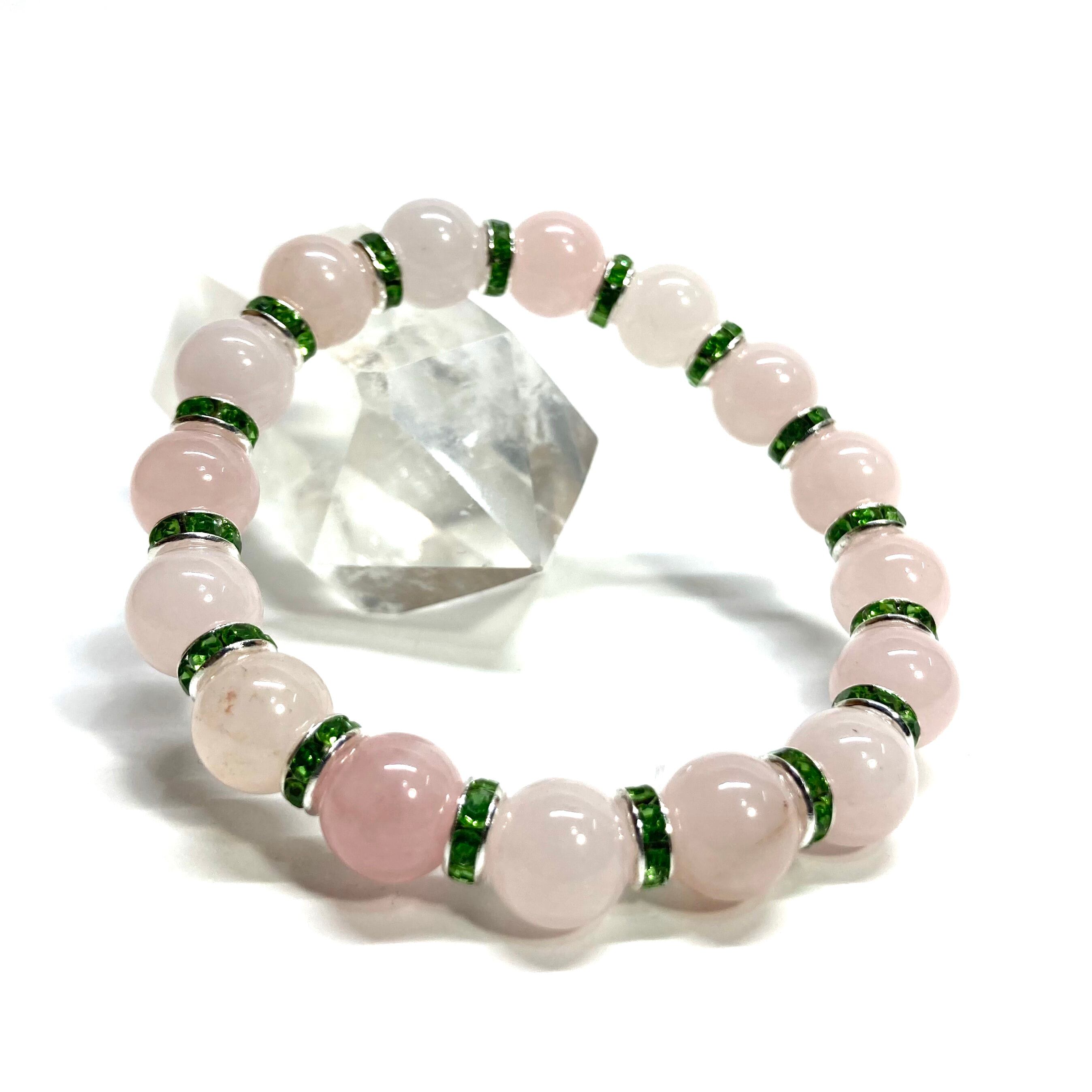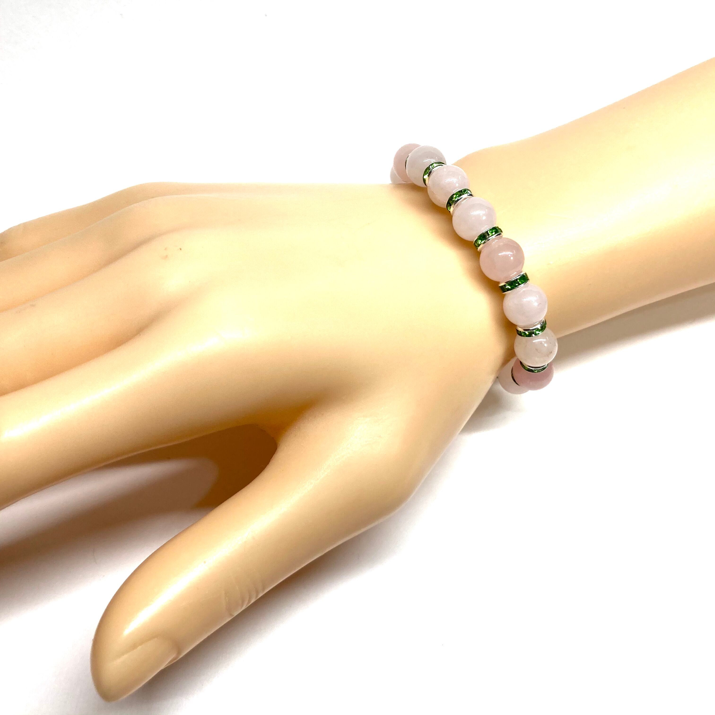 こちらは、ローズクォーツの8mm玉を使用したパワーストーンブレスレットです。石との間にはロンデルを挟み高級感を演出しております。シンプルなデザインは、シーン問わずどんなコーディネートとも合わせ易いブレスレットです。サイズは内周約18cm (手首周りを測り少し余裕をもってお買い求めくださいませ。)です。当社の中でも一番人気の実績があるデザインとなっております。気になる方はお早めにどうぞ。
