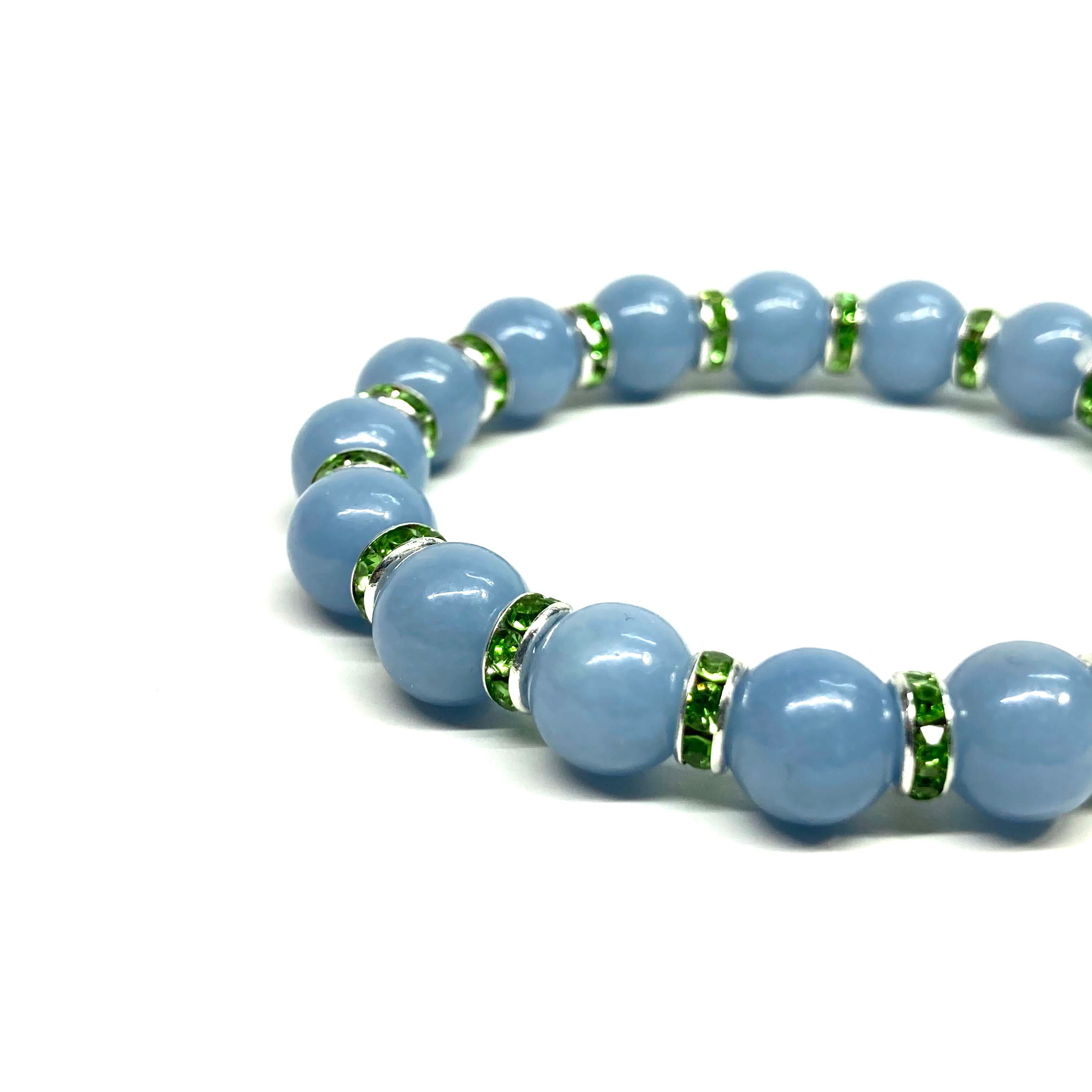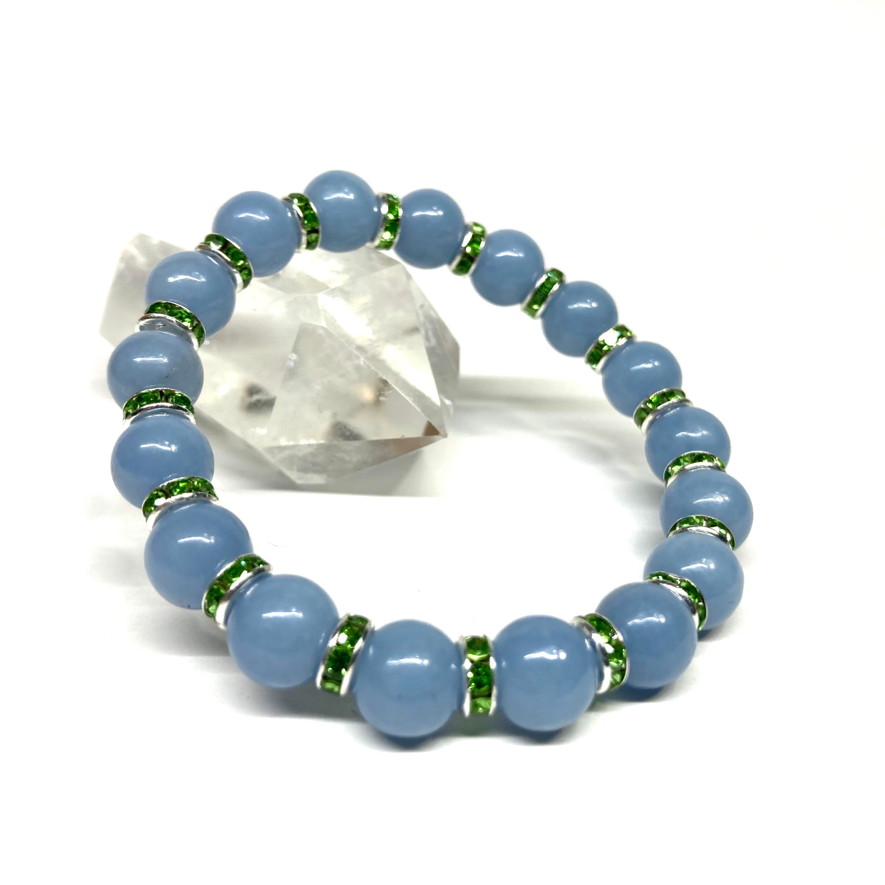こちらは、エンジェライトの8mm玉を使用したパワーストーンブレスレットです。石との間にはロンデルを挟み高級感を演出しております。シンプルなデザインは、シーン問わずどんなコーディネートとも合わせ易いブレスレットです。サイズは内周約16cm (手首周りを測り少し余裕をもってお買い求めくださいませ。)です。当社の中でも一番人気の実績があるデザインとなっております。気になる方はお早めにどうぞ。