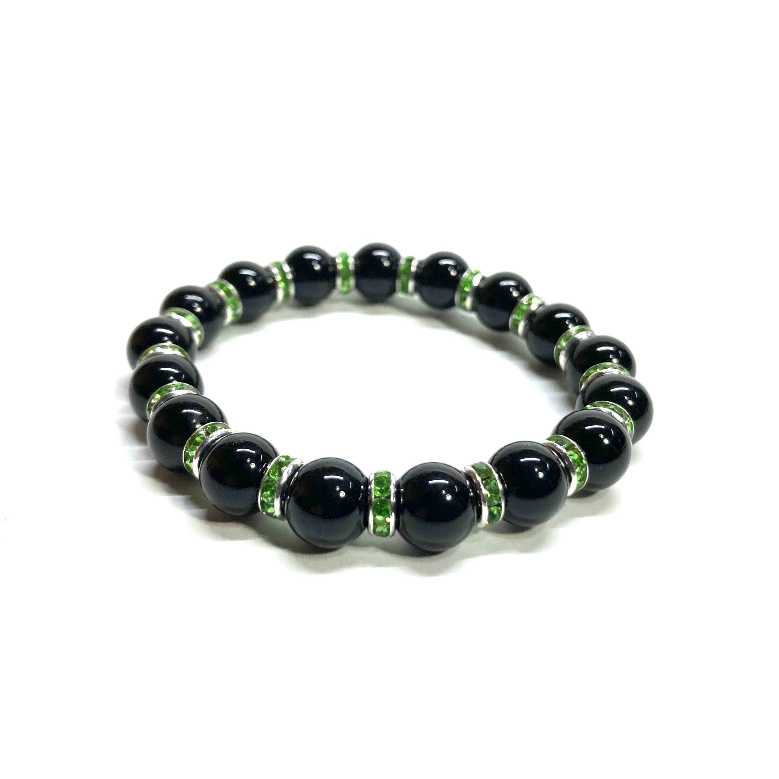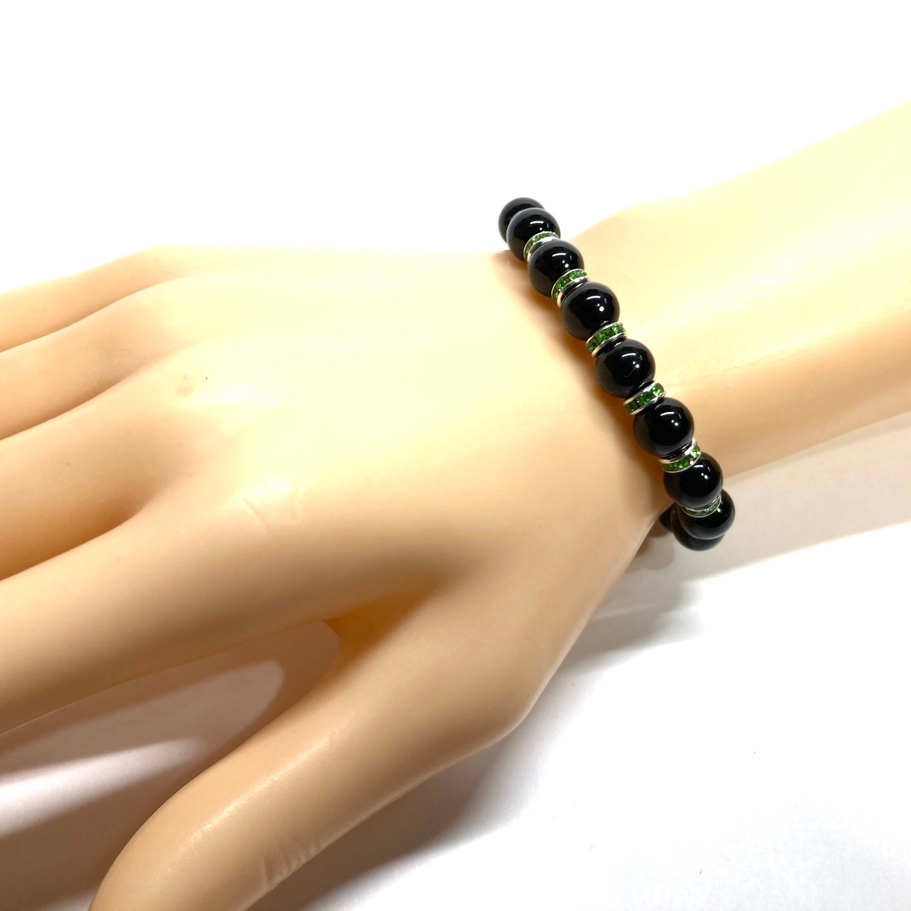 こちらは、オニキスの8mm玉を使用したパワーストーンブレスレットです。石との間にはロンデルを挟み高級感を演出しております。シンプルなデザインは、シーン問わずどんなコーディネートとも合わせ易いブレスレットです。サイズは内周約16cm (手首周りを測り少し余裕をもってお買い求めくださいませ。)です。当社の中でも一番人気の実績があるデザインとなっております。気になる方はお早めにどうぞ。