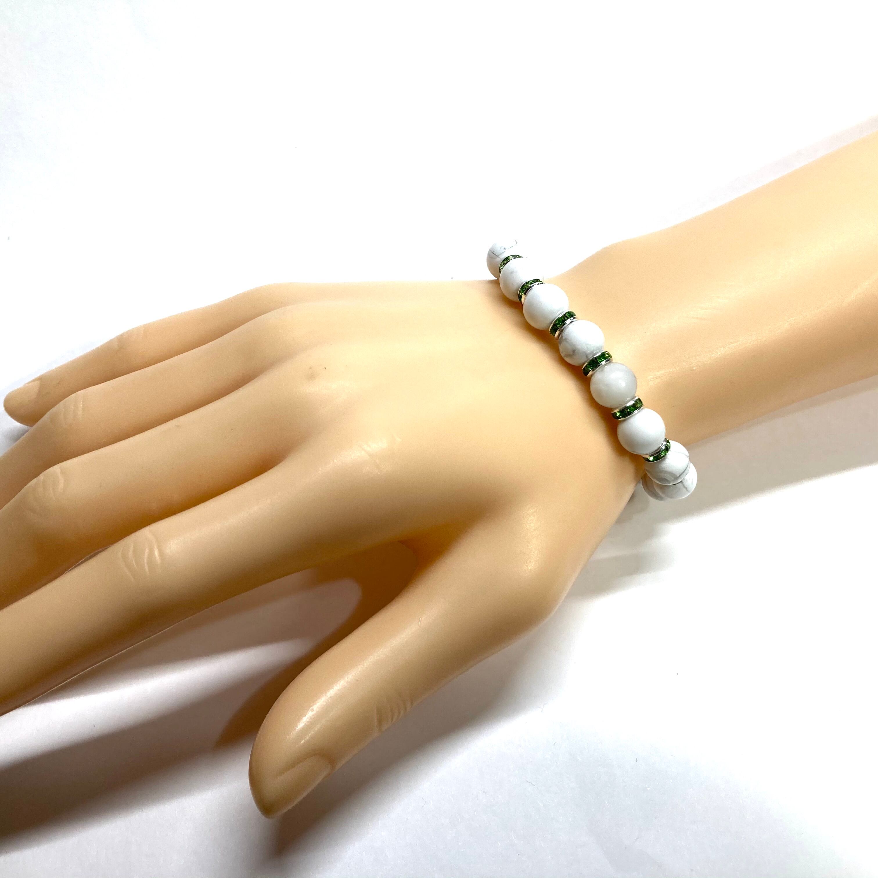 こちらは、ハウライトの8mm玉を使用したパワーストーンブレスレットです。石との間にはロンデルを挟み高級感を演出しております。シンプルなデザインは、シーン問わずどんなコーディネートとも合わせ易いブレスレットです。サイズは内周約15cm (手首周りを測り少し余裕をもってお買い求めくださいませ。)です。当社の中でも一番人気の実績があるデザインとなっております。気になる方はお早めにどうぞ。