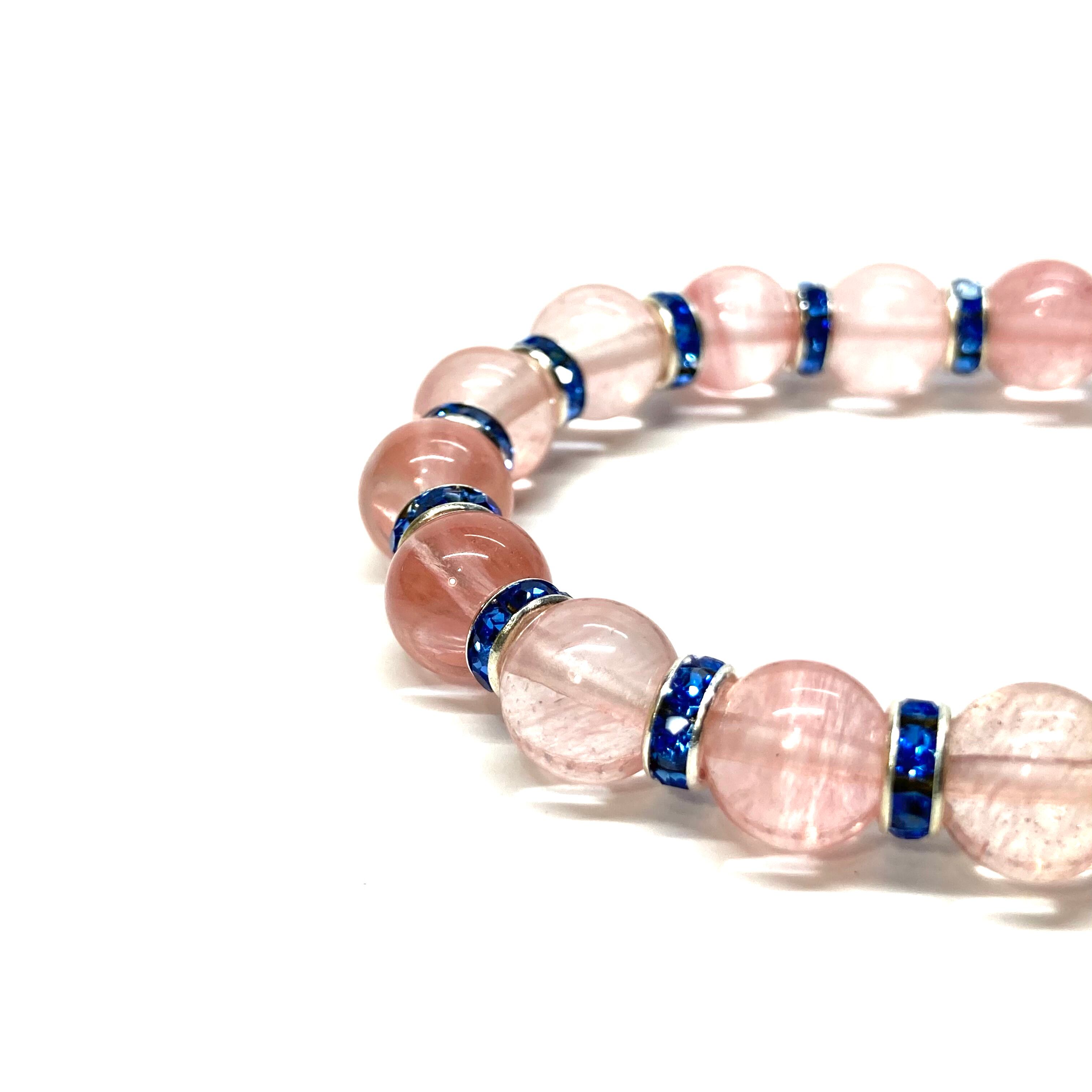 こちらは、チェリークォーツの8mm玉を使用したパワーストーンブレスレットです。石との間にはロンデルを挟み高級感を演出しております。シンプルなデザインは、シーン問わずどんなコーディネートとも合わせ易いブレスレットです。サイズは内周約22cm (手首周りを測り少し余裕をもってお買い求めくださいませ。)です。当社の中でも一番人気の実績があるデザインとなっております。気になる方はお早めにどうぞ。