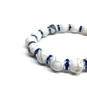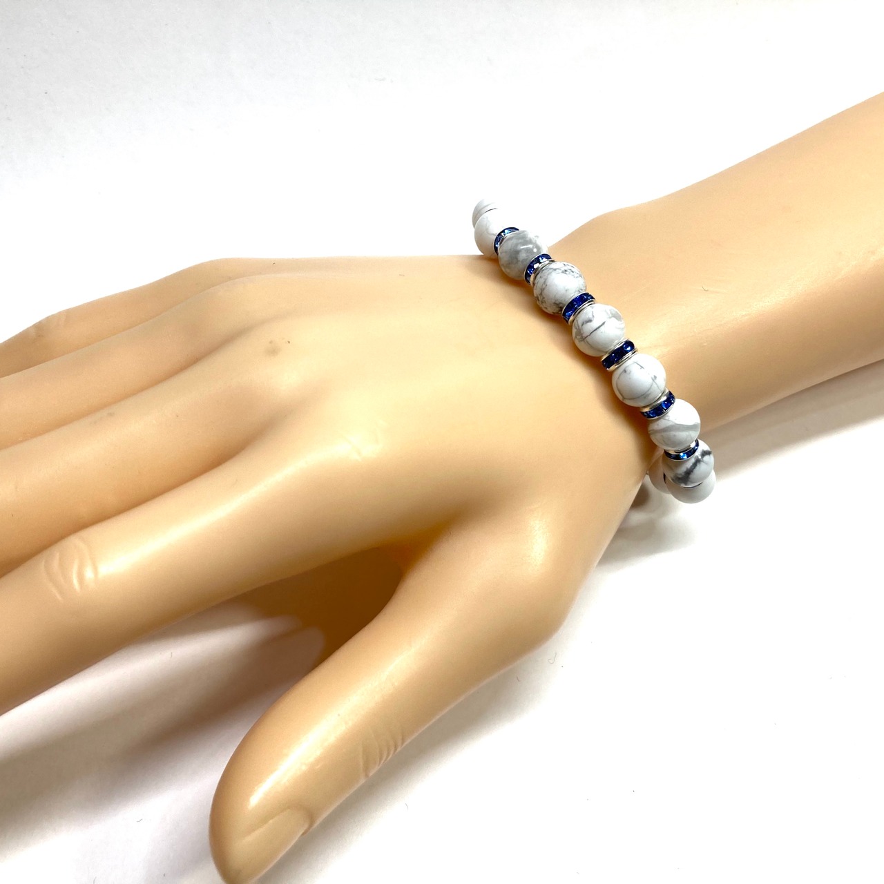 こちらは、ハウライトの8mm玉を使用したパワーストーンブレスレットです。石との間にはロンデルを挟み高級感を演出しております。シンプルなデザインは、シーン問わずどんなコーディネートとも合わせ易いブレスレットです。サイズは内周約19cm (手首周りを測り少し余裕をもってお買い求めくださいませ。)です。当社の中でも一番人気の実績があるデザインとなっております。気になる方はお早めにどうぞ。