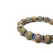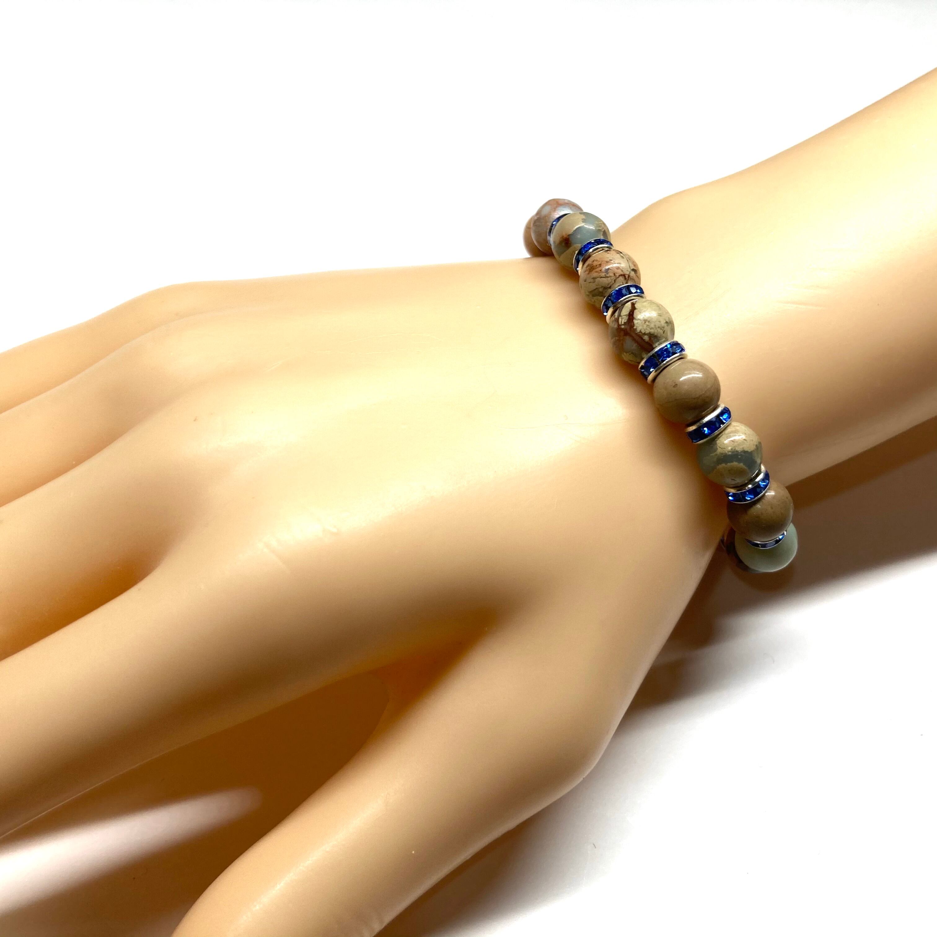 こちらは、インプレッションストーンの8mm玉を使用したパワーストーンブレスレットです。石との間にはロンデルを挟み高級感を演出しております。シンプルなデザインは、シーン問わずどんなコーディネートとも合わせ易いブレスレットです。サイズは内周約16cm (手首周りを測り少し余裕をもってお買い求めくださいませ。)です。当社の中でも一番人気の実績があるデザインとなっております。気になる方はお早めにどうぞ。