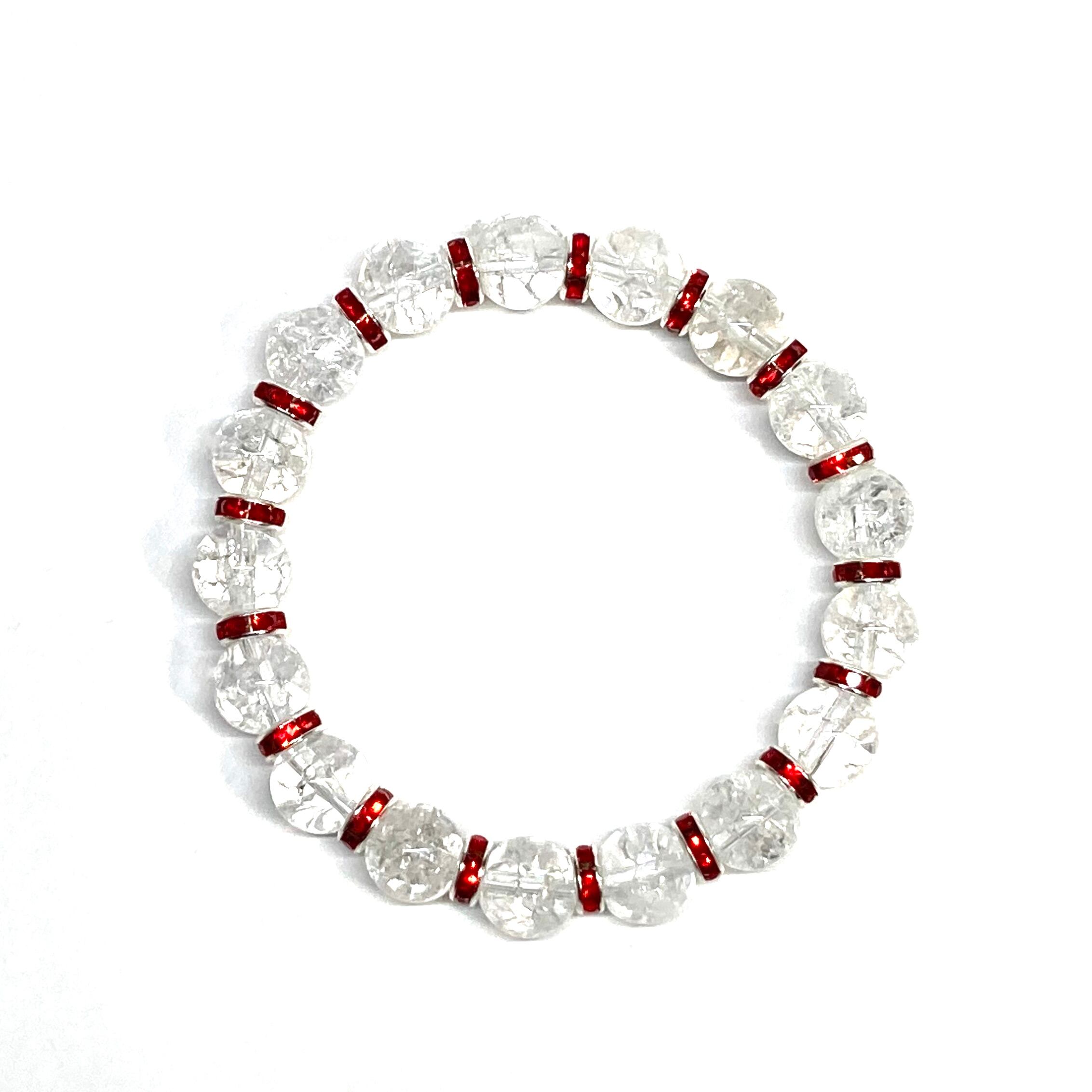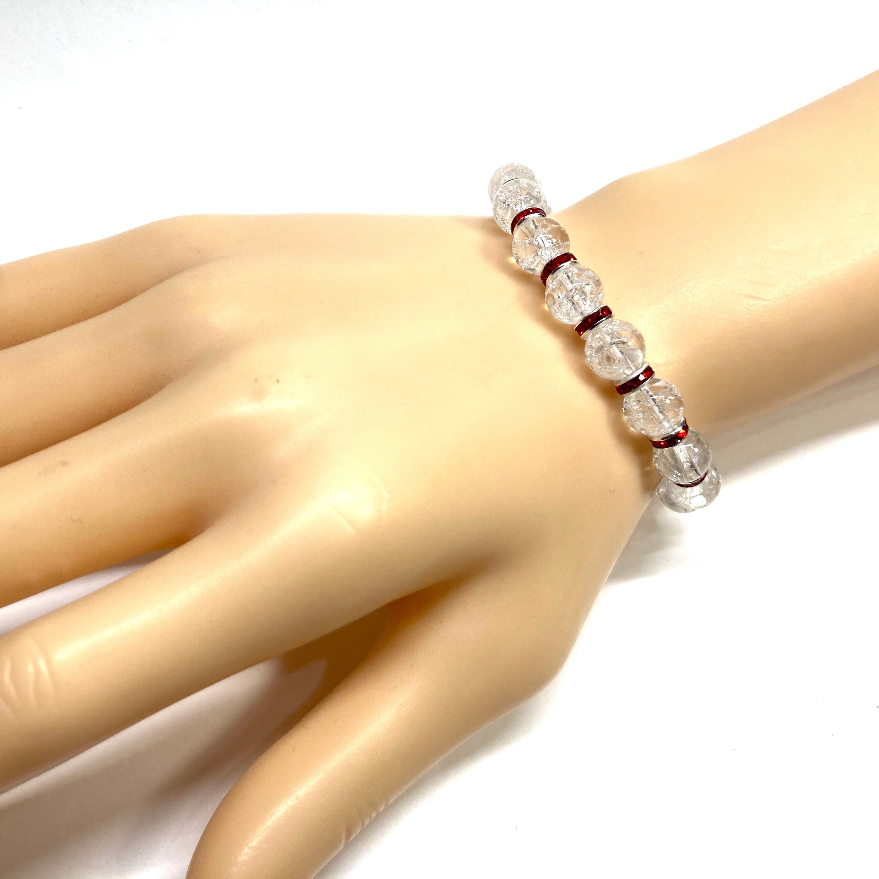 こちらは、クラック水晶の8mm玉を使用したパワーストーンブレスレットです。石との間にはロンデルを挟み高級感を演出しております。シンプルなデザインは、シーン問わずどんなコーディネートとも合わせ易いブレスレットです。サイズは内周約22cm (手首周りを測り少し余裕をもってお買い求めくださいませ。)です。当社の中でも一番人気の実績があるデザインとなっております。気になる方はお早めにどうぞ。