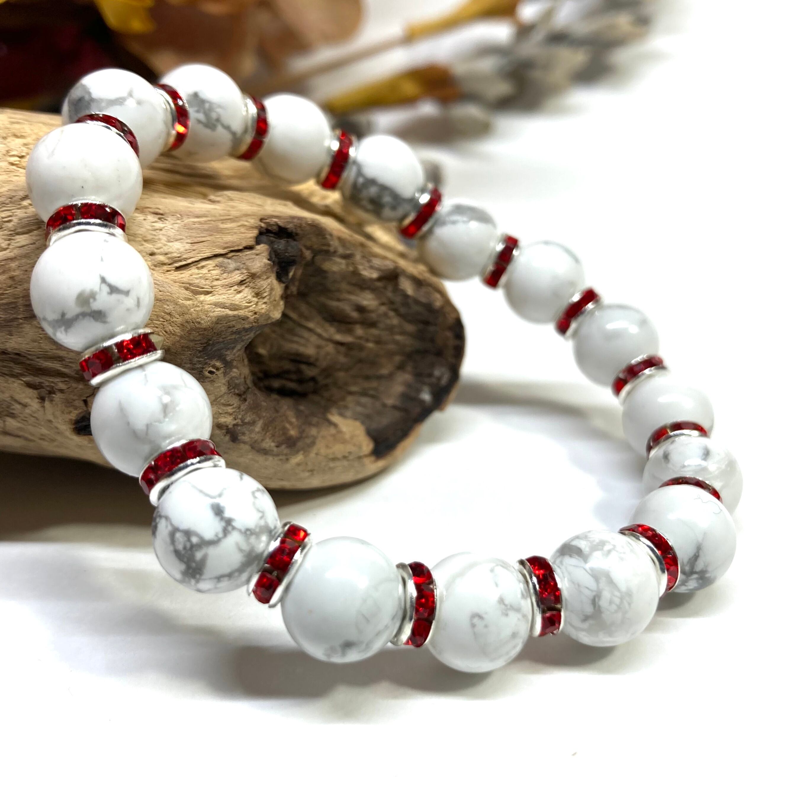 こちらは、ハウライトの8mm玉を使用したパワーストーンブレスレットです。石との間にはロンデルを挟み高級感を演出しております。シンプルなデザインは、シーン問わずどんなコーディネートとも合わせ易いブレスレットです。サイズは内周約19cm (手首周りを測り少し余裕をもってお買い求めくださいませ。)です。当社の中でも一番人気の実績があるデザインとなっております。気になる方はお早めにどうぞ。