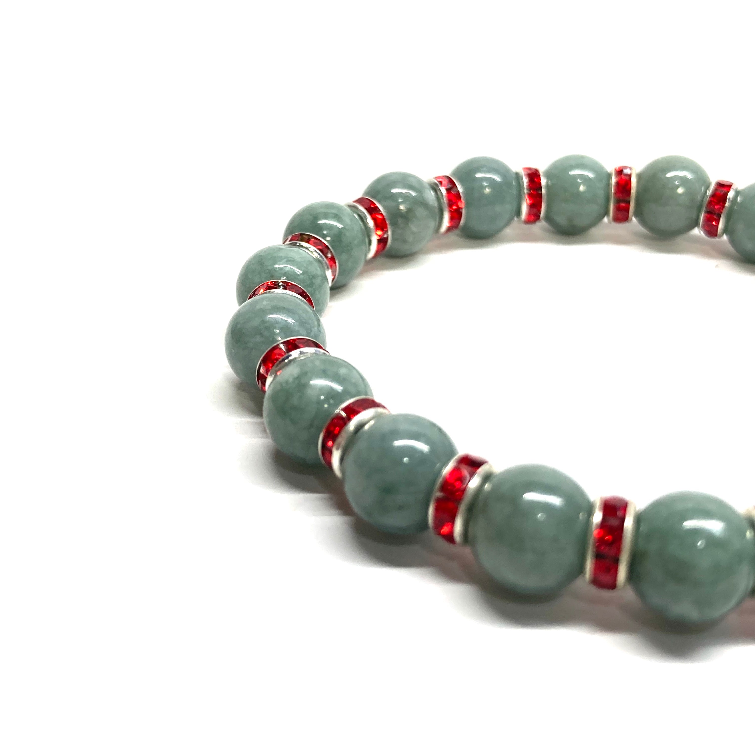 こちらは、ビルマ翡翠の8mm玉を使用したパワーストーンブレスレットです。石との間にはロンデルを挟み高級感を演出しております。シンプルなデザインは、シーン問わずどんなコーディネートとも合わせ易いブレスレットです。サイズは内周約16cm (手首周りを測り少し余裕をもってお買い求めくださいませ。)です。当社の中でも一番人気の実績があるデザインとなっております。気になる方はお早めにどうぞ。