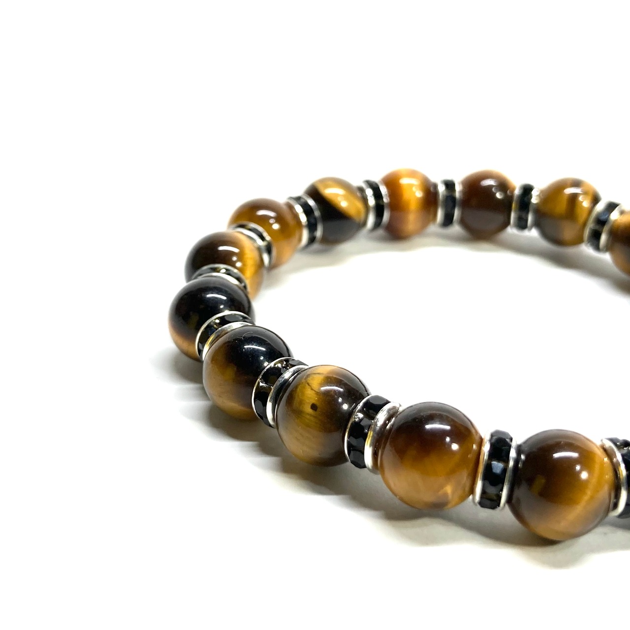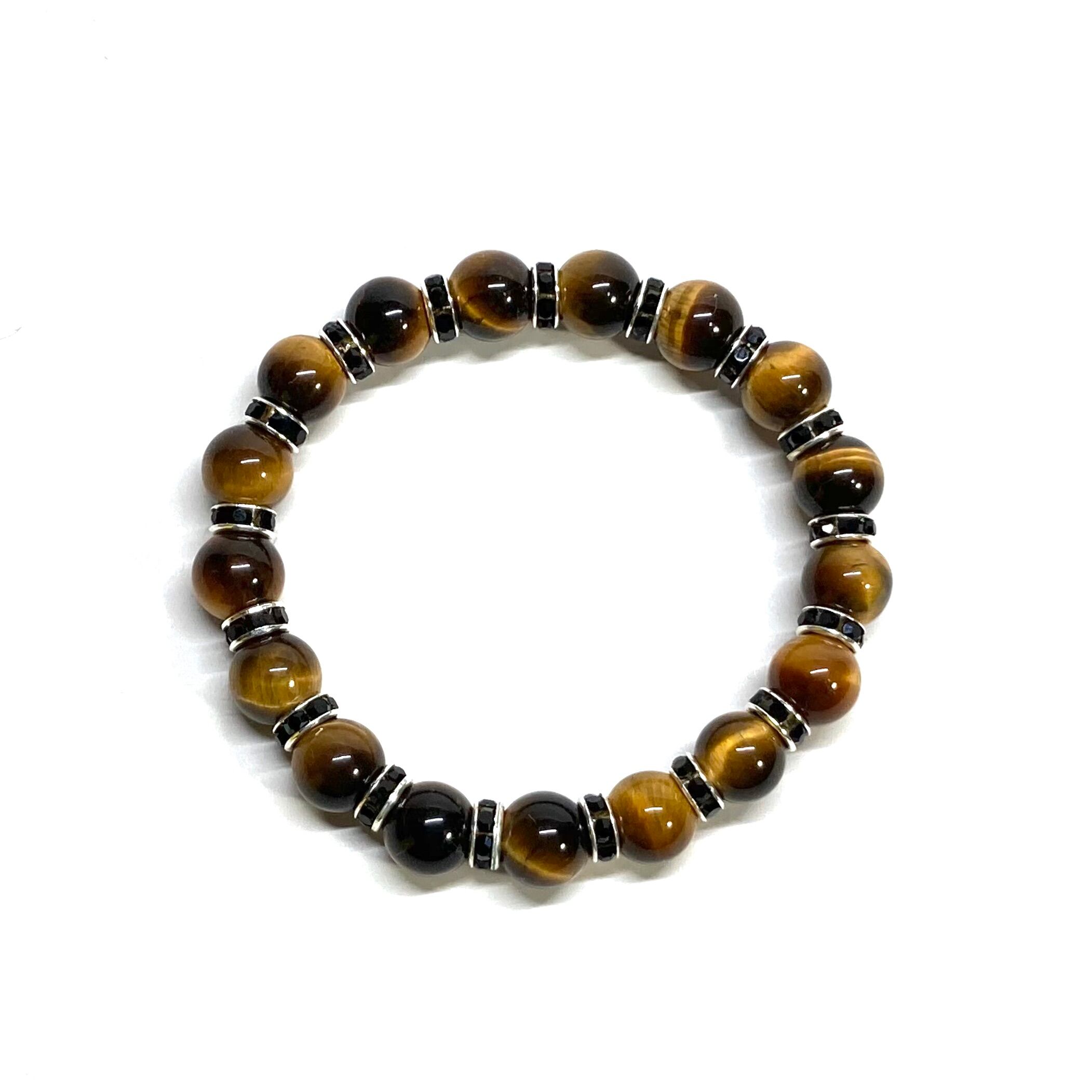 こちらは、タイガーアイの8mm玉を使用したパワーストーンブレスレットです。石との間にはロンデルを挟み高級感を演出しております。シンプルなデザインは、シーン問わずどんなコーディネートとも合わせ易いブレスレットです。サイズは内周約21cm (手首周りを測り少し余裕をもってお買い求めくださいませ。)です。当社の中でも一番人気の実績があるデザインとなっております。気になる方はお早めにどうぞ。