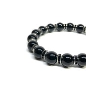 こちらは、オニキスの8mm玉を使用したパワーストーンブレスレットです。石との間にはロンデルを挟み高級感を演出しております。シンプルなデザインは、シーン問わずどんなコーディネートとも合わせ易いブレスレットです。サイズは内周約19cm (手首周りを測り少し余裕をもってお買い求めくださいませ。)です。当社の中でも一番人気の実績があるデザインとなっております。気になる方はお早めにどうぞ。