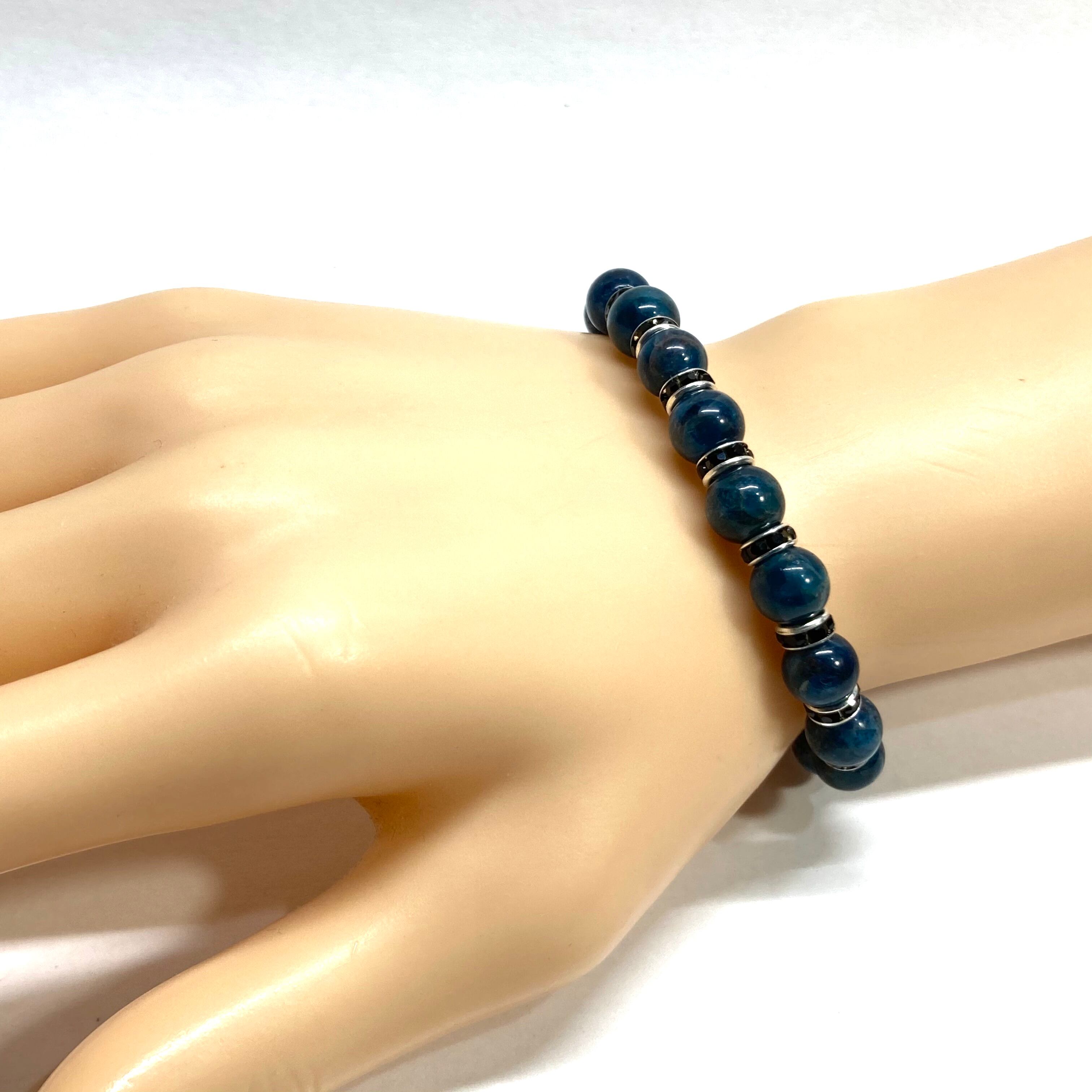 こちらは、アパタイトの8mm玉を使用したパワーストーンブレスレットです。石との間にはロンデルを挟み高級感を演出しております。シンプルなデザインは、シーン問わずどんなコーディネートとも合わせ易いブレスレットです。サイズは内周約18cm (手首周りを測り少し余裕をもってお買い求めくださいませ。)です。当社の中でも一番人気の実績があるデザインとなっております。気になる方はお早めにどうぞ。