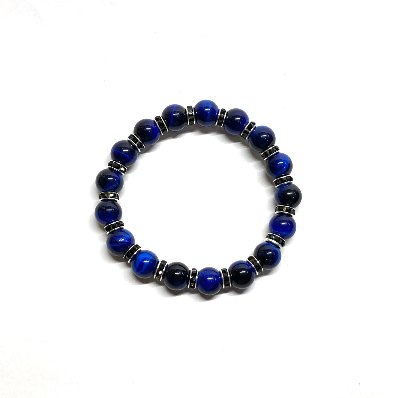 こちらは、ブルータイガーアイ の8mm玉を使用したパワーストーンブレスレットです。石との間にはロンデルを挟み高級感を演出しております。シンプルなデザインは、シーン問わずどんなコーディネートとも合わせ易いブレスレットです。サイズは内周約17cm (手首周りを測り少し余裕をもってお買い求めくださいませ。)です。当社の中でも一番人気の実績があるデザインとなっております。気になる方はお早めにどうぞ。