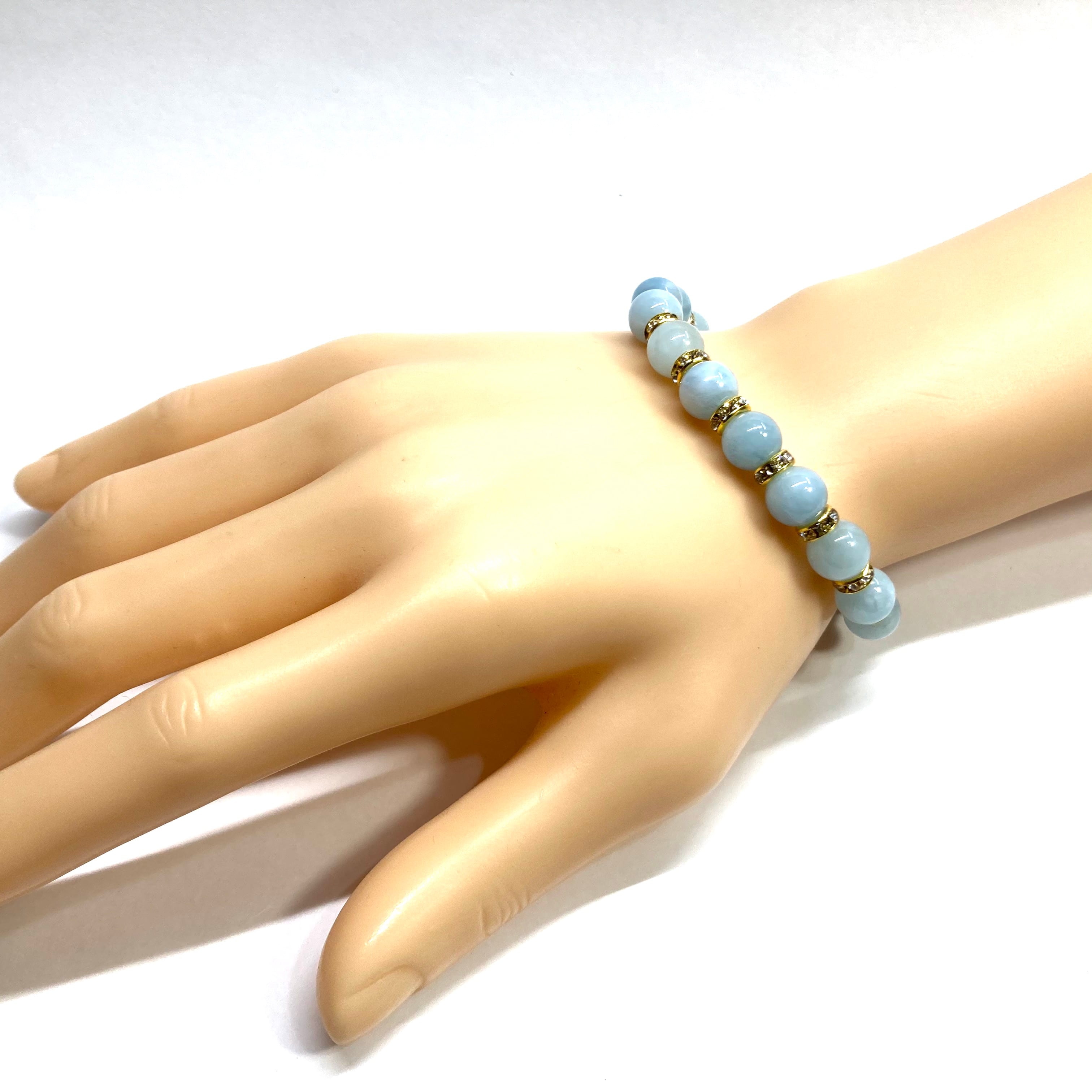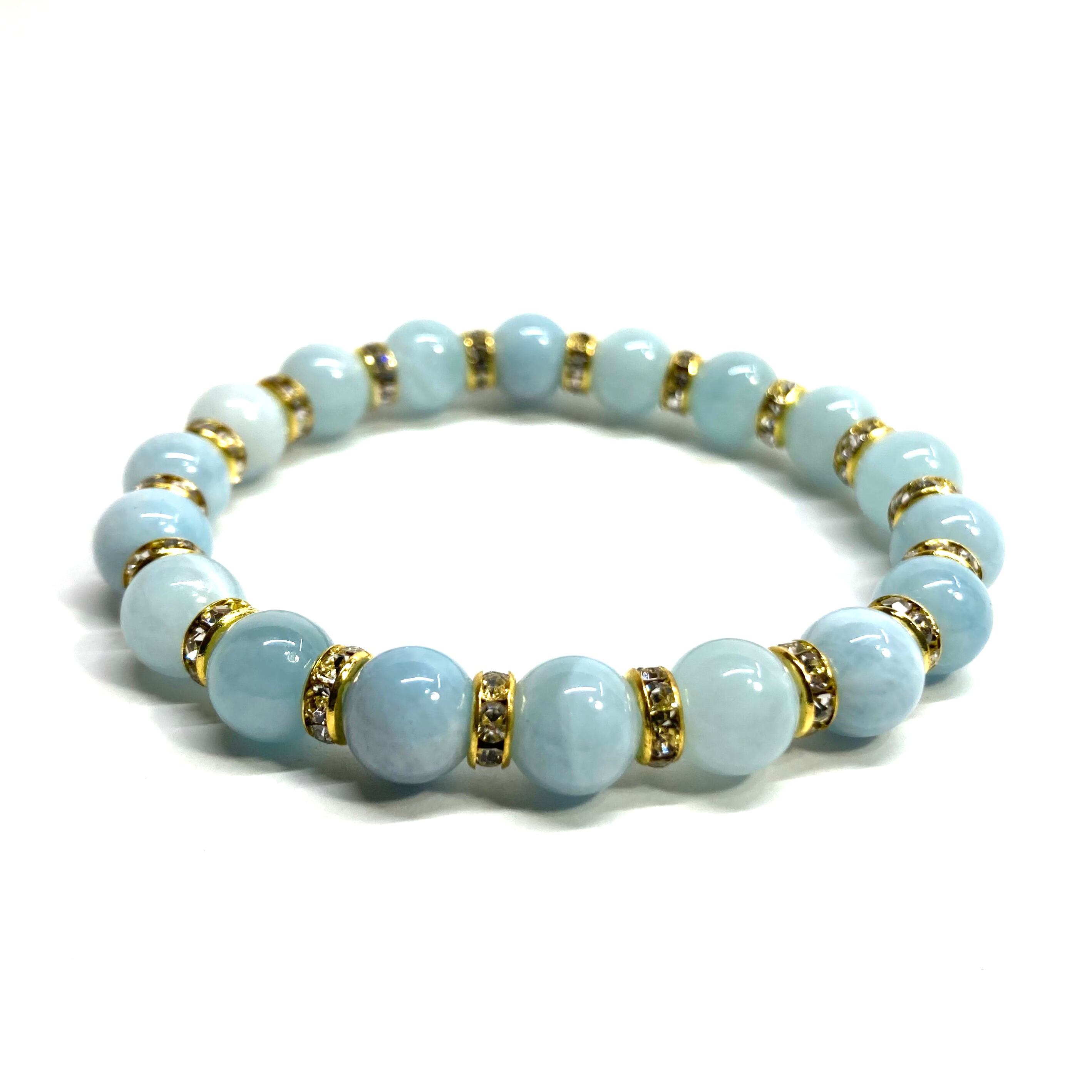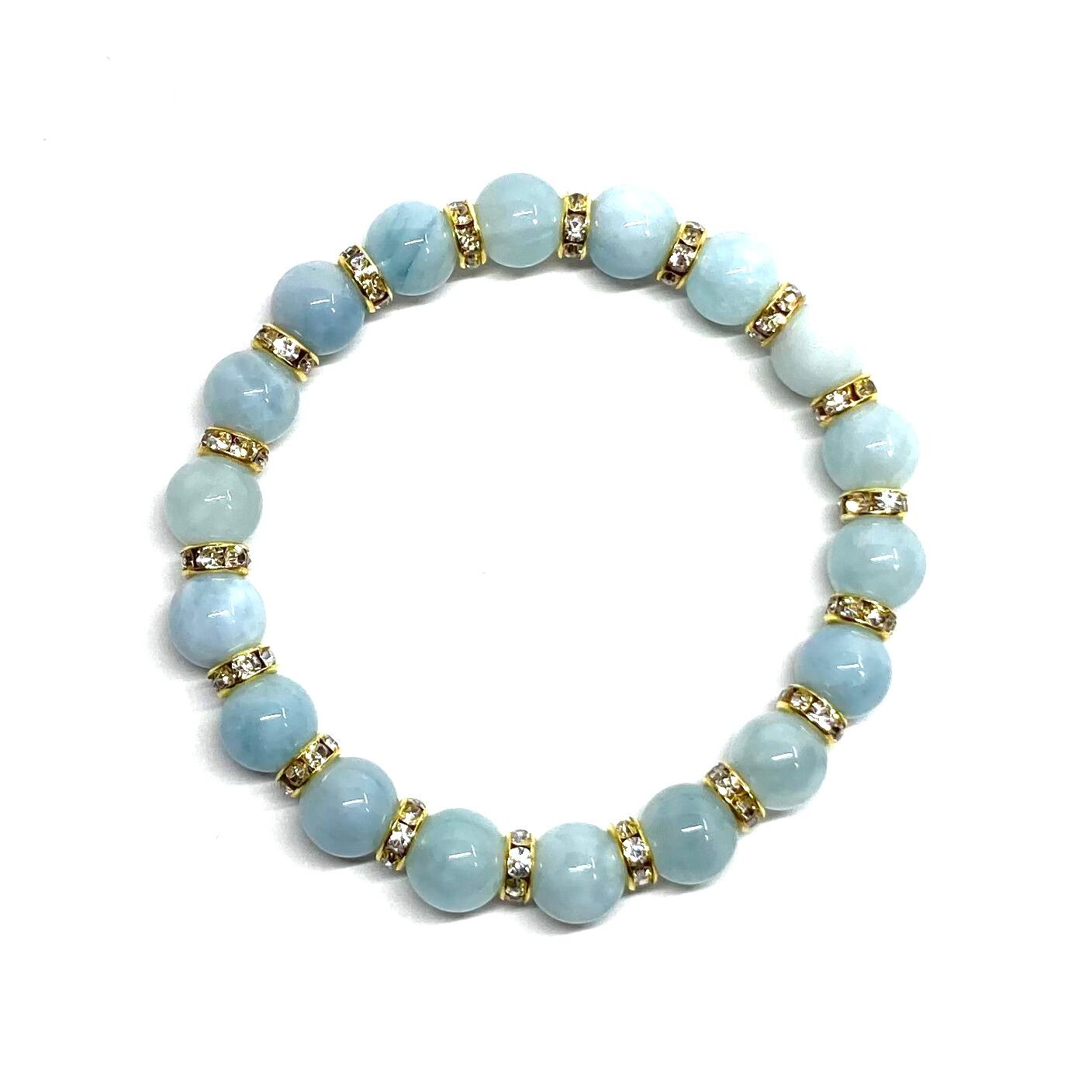 こちらは、アクアマリンの8mm玉を使用したパワーストーンブレスレットです。石との間にはロンデルを挟み高級感を演出しております。シンプルなデザインは、シーン問わずどんなコーディネートとも合わせ易いブレスレットです。サイズは内周約22cm (手首周りを測り少し余裕をもってお買い求めくださいませ。)です。当社の中でも一番人気の実績があるデザインとなっております。気になる方はお早めにどうぞ。