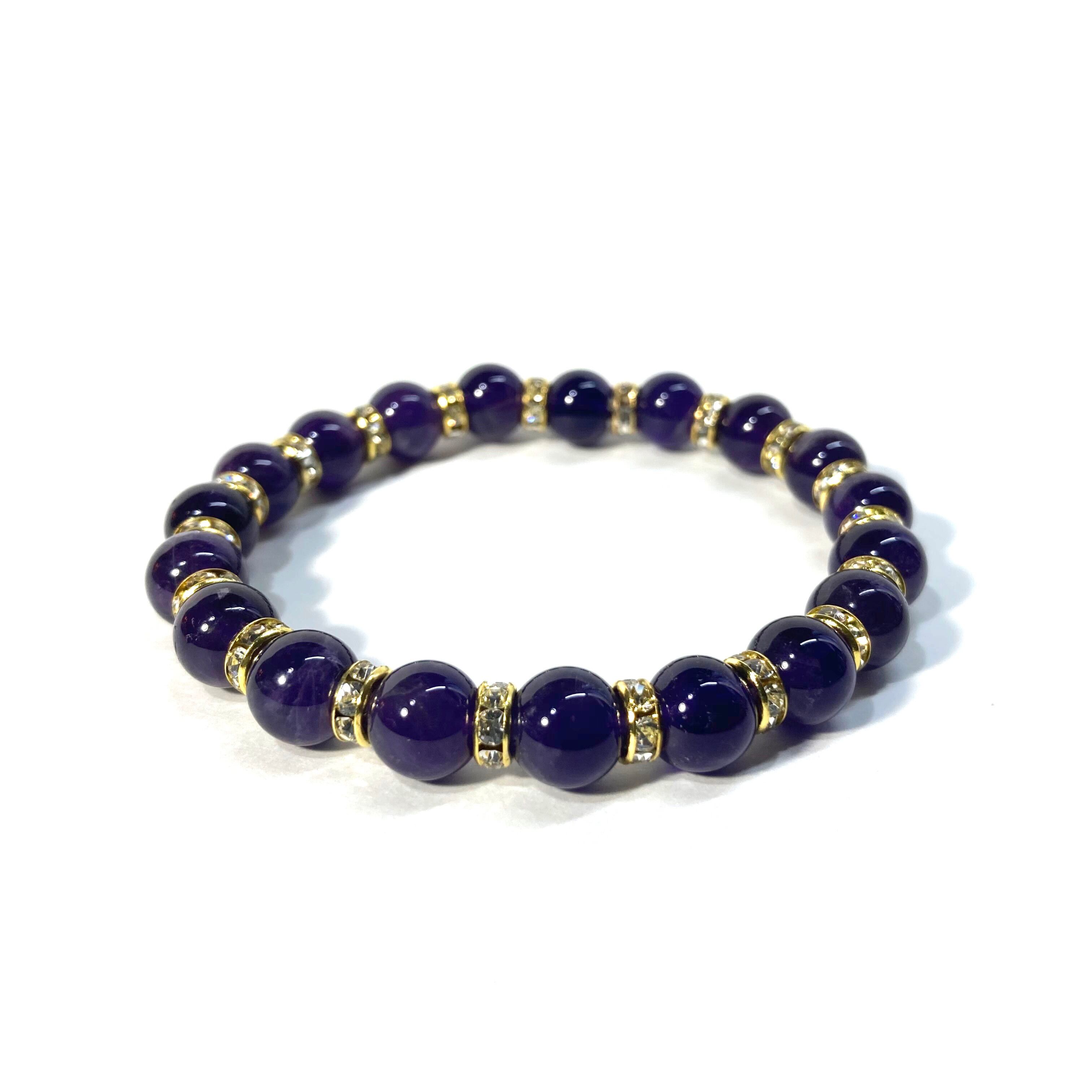 こちらは、アメジストの8mm玉を使用したパワーストーンブレスレットです。石との間にはロンデルを挟み高級感を演出しております。シンプルなデザインは、シーン問わずどんなコーディネートとも合わせ易いブレスレットです。サイズは内周約22cm (手首周りを測り少し余裕をもってお買い求めくださいませ。)です。当社の中でも一番人気の実績があるデザインとなっております。気になる方はお早めにどうぞ。