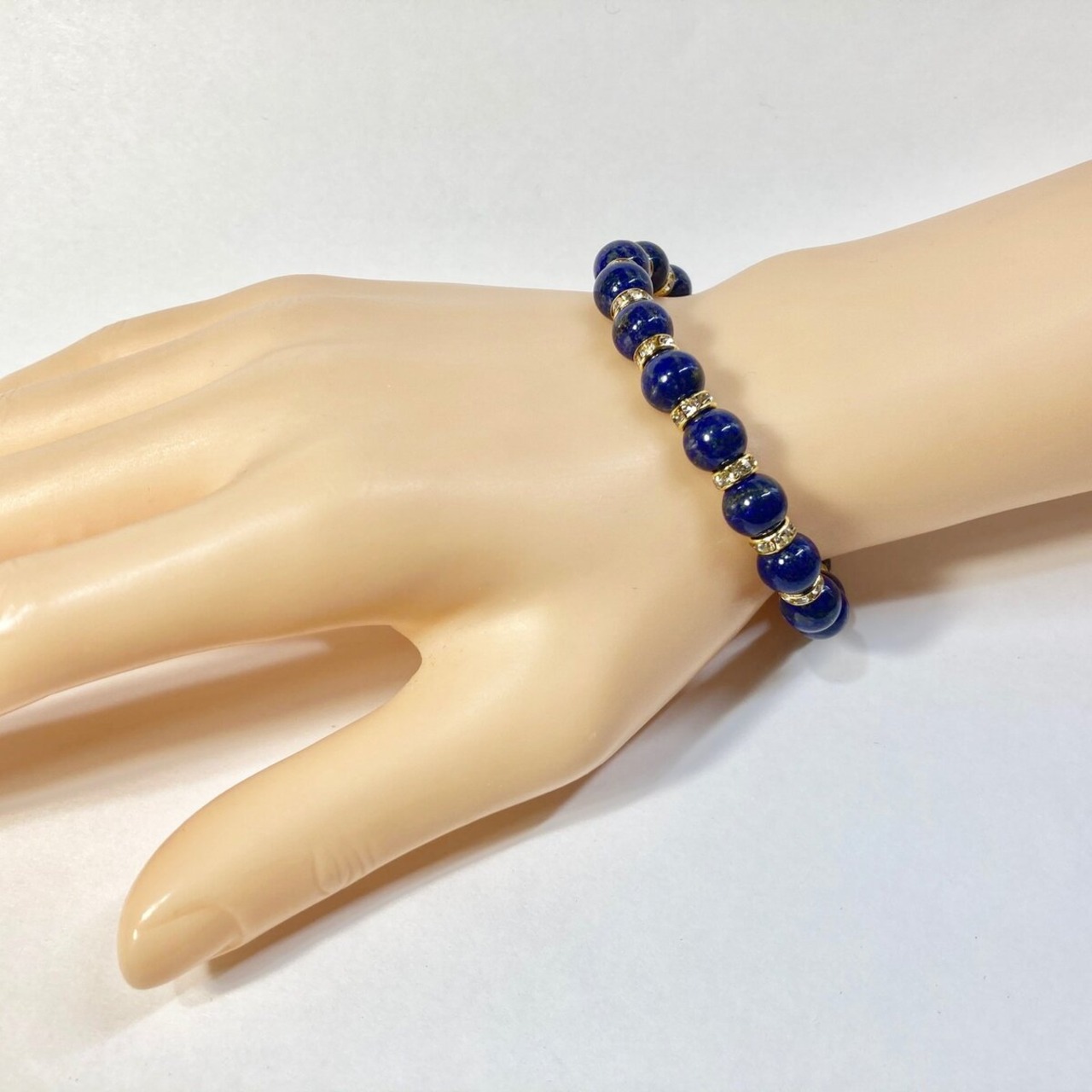 こちらは、ラピスラズリの8mm玉を使用したパワーストーンブレスレットです。石との間にはロンデルを挟み高級感を演出しております。シンプルなデザインは、シーン問わずどんなコーディネートとも合わせ易いブレスレットです。サイズは内周約19cm (手首周りを測り少し余裕をもってお買い求めくださいませ。)です。当社の中でも一番人気の実績があるデザインとなっております。気になる方はお早めにどうぞ。