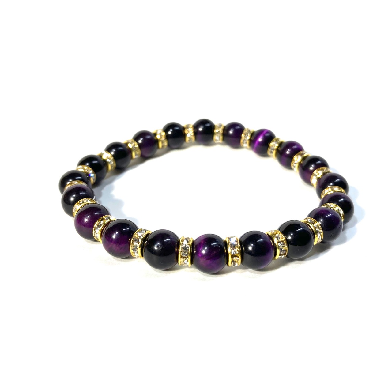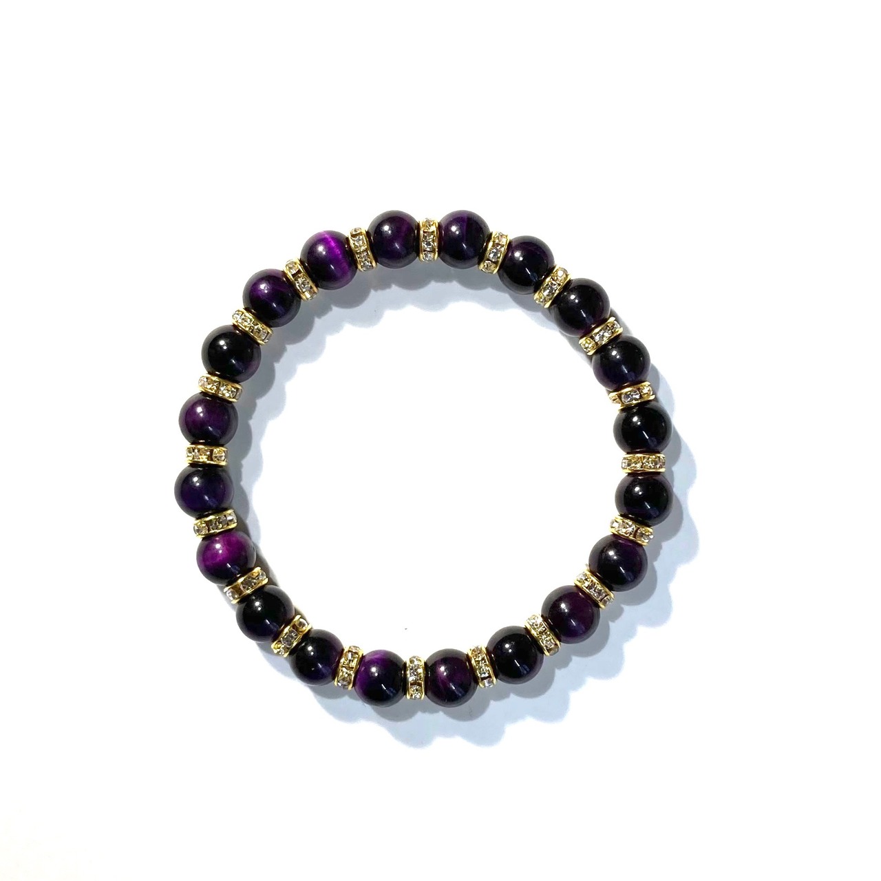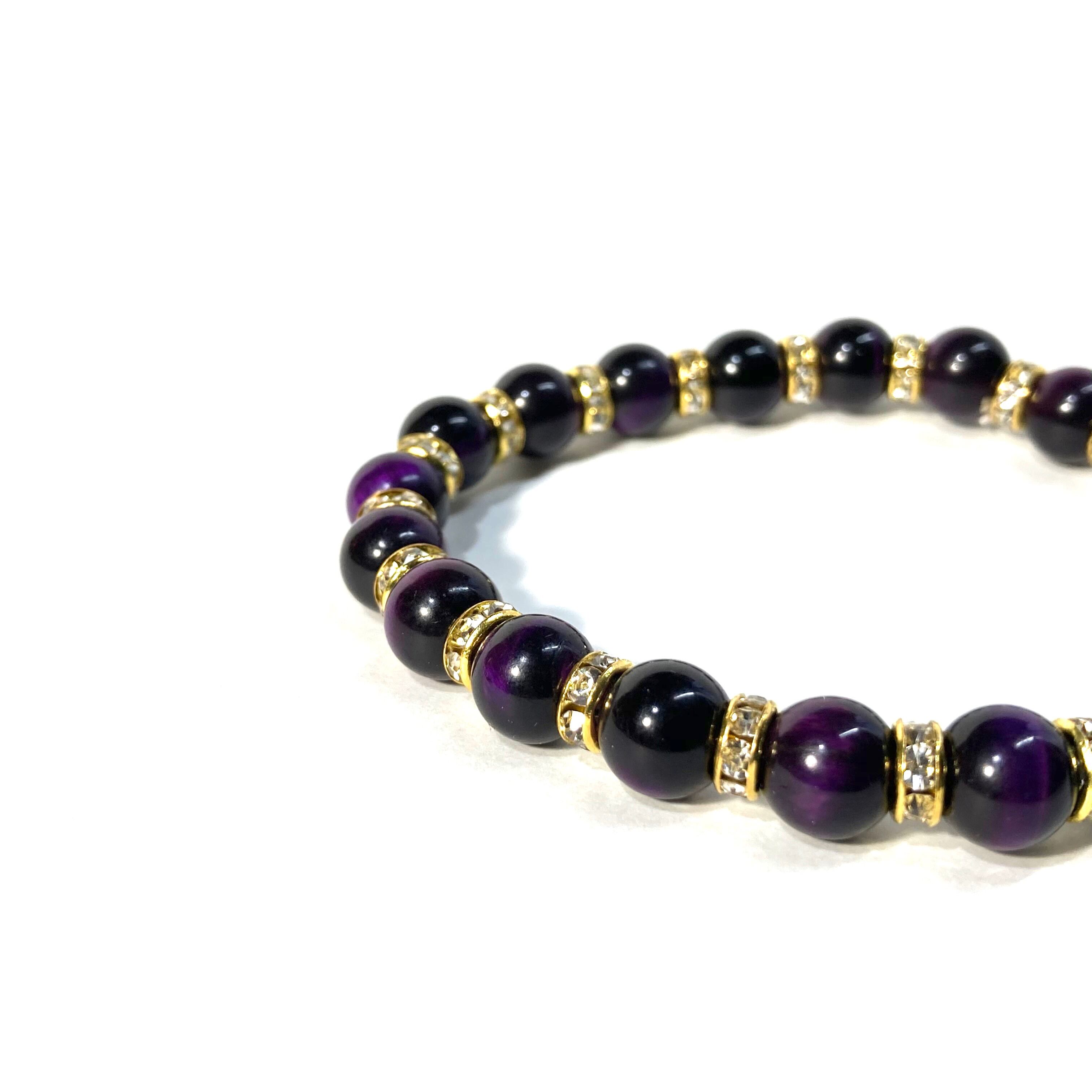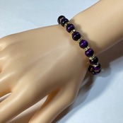 こちらは、パープルタイガーアイの8mm玉を使用したパワーストーンブレスレットです。石との間にはロンデルを挟み高級感を演出しております。シンプルなデザインは、シーン問わずどんなコーディネートとも合わせ易いブレスレットです。サイズは内周約18cm (手首周りを測り少し余裕をもってお買い求めくださいませ。)です。当社の中でも一番人気の実績があるデザインとなっております。気になる方はお早めにどうぞ。