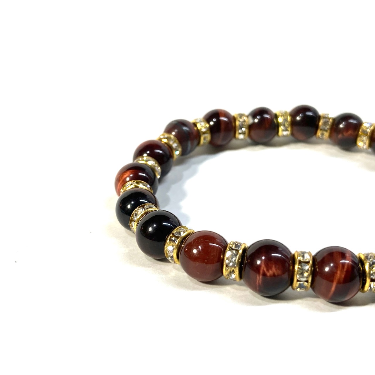 こちらは、レッドタイガーアイの8mm玉を使用したパワーストーンブレスレットです。石との間にはロンデルを挟み高級感を演出しております。シンプルなデザインは、シーン問わずどんなコーディネートとも合わせ易いブレスレットです。サイズは内周約18cm (手首周りを測り少し余裕をもってお買い求めくださいませ。)です。当社の中でも一番人気の実績があるデザインとなっております。気になる方はお早めにどうぞ。