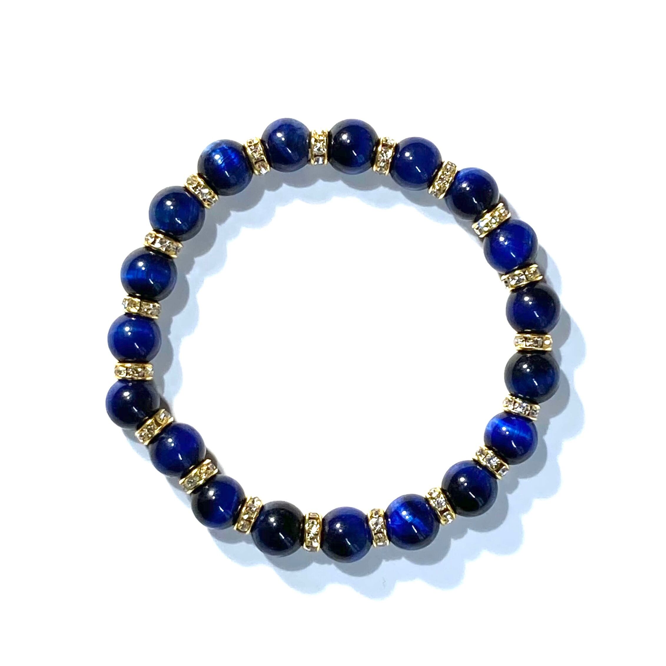 こちらは、ブルータイガーアイ の8mm玉を使用したパワーストーンブレスレットです。石との間にはロンデルを挟み高級感を演出しております。シンプルなデザインは、シーン問わずどんなコーディネートとも合わせ易いブレスレットです。サイズは内周約17cm (手首周りを測り少し余裕をもってお買い求めくださいませ。)です。当社の中でも一番人気の実績があるデザインとなっております。気になる方はお早めにどうぞ。