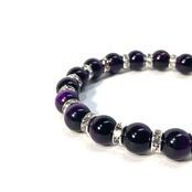 こちらは、パープルタイガーアイの8mm玉を使用したパワーストーンブレスレットです。石との間にはロンデルを挟み高級感を演出しております。シンプルなデザインは、シーン問わずどんなコーディネートとも合わせ易いブレスレットです。サイズは内周約20cm (手首周りを測り少し余裕をもってお買い求めくださいませ。)です。当社の中でも一番人気の実績があるデザインとなっております。気になる方はお早めにどうぞ。