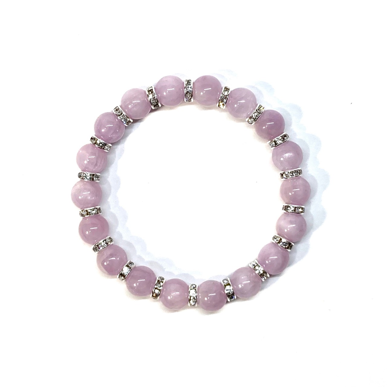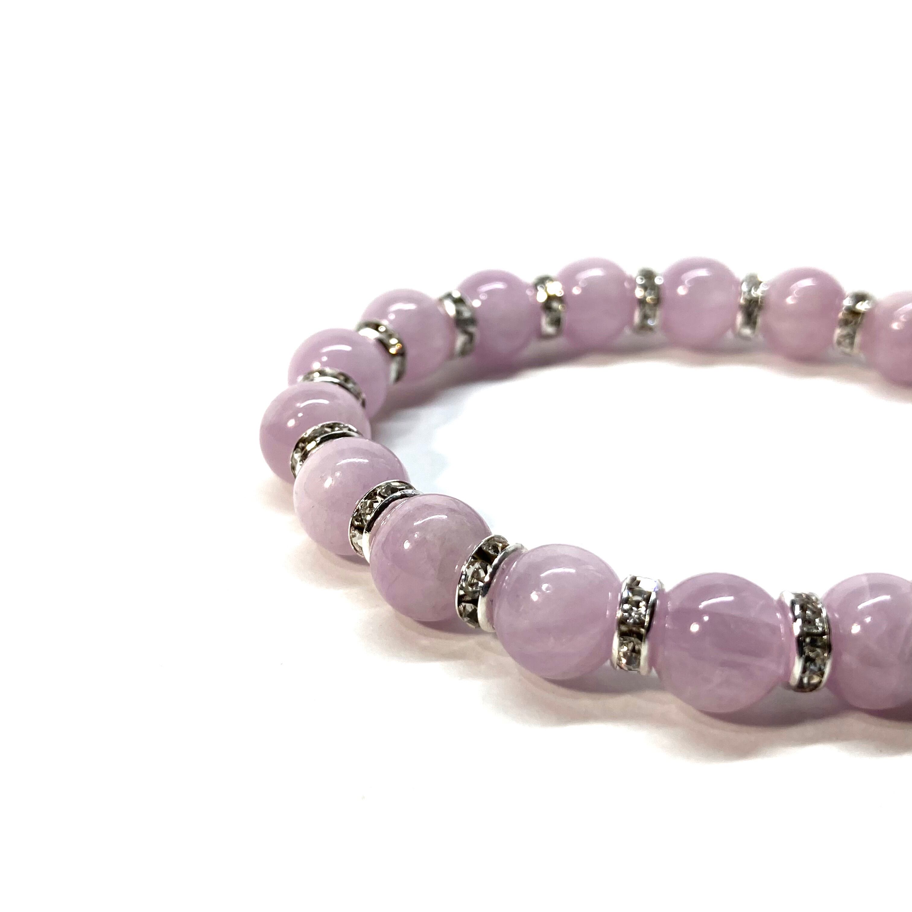 こちらは、クンツァイトの8mm玉を使用したパワーストーンブレスレットです。石との間にはロンデルを挟み高級感を演出しております。シンプルなデザインは、シーン問わずどんなコーディネートとも合わせ易いブレスレットです。サイズは内周約18cm (手首周りを測り少し余裕をもってお買い求めくださいませ。)です。当社の中でも一番人気の実績があるデザインとなっております。気になる方はお早めにどうぞ。