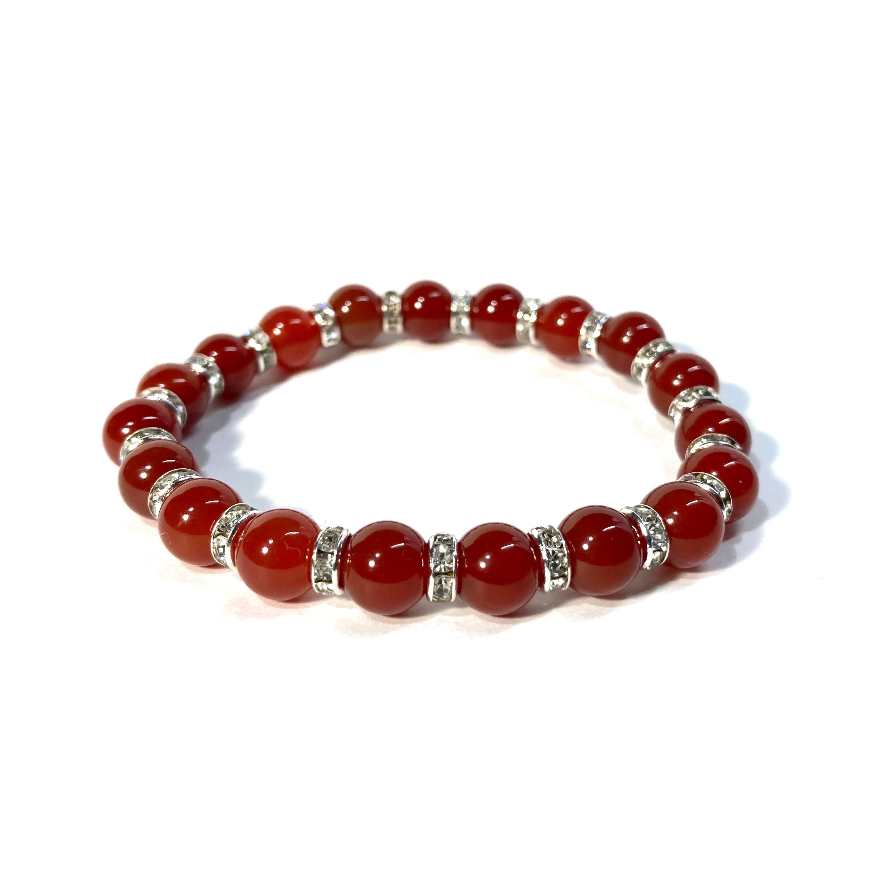 こちらは、赤瑪瑙の8mm玉を使用したパワーストーンブレスレットです。石との間にはロンデルを挟み高級感を演出しております。シンプルなデザインは、シーン問わずどんなコーディネートとも合わせ易いブレスレットです。サイズは内周約18cm (手首周りを測り少し余裕をもってお買い求めくださいませ。)です。当社の中でも一番人気の実績があるデザインとなっております。気になる方はお早めにどうぞ。