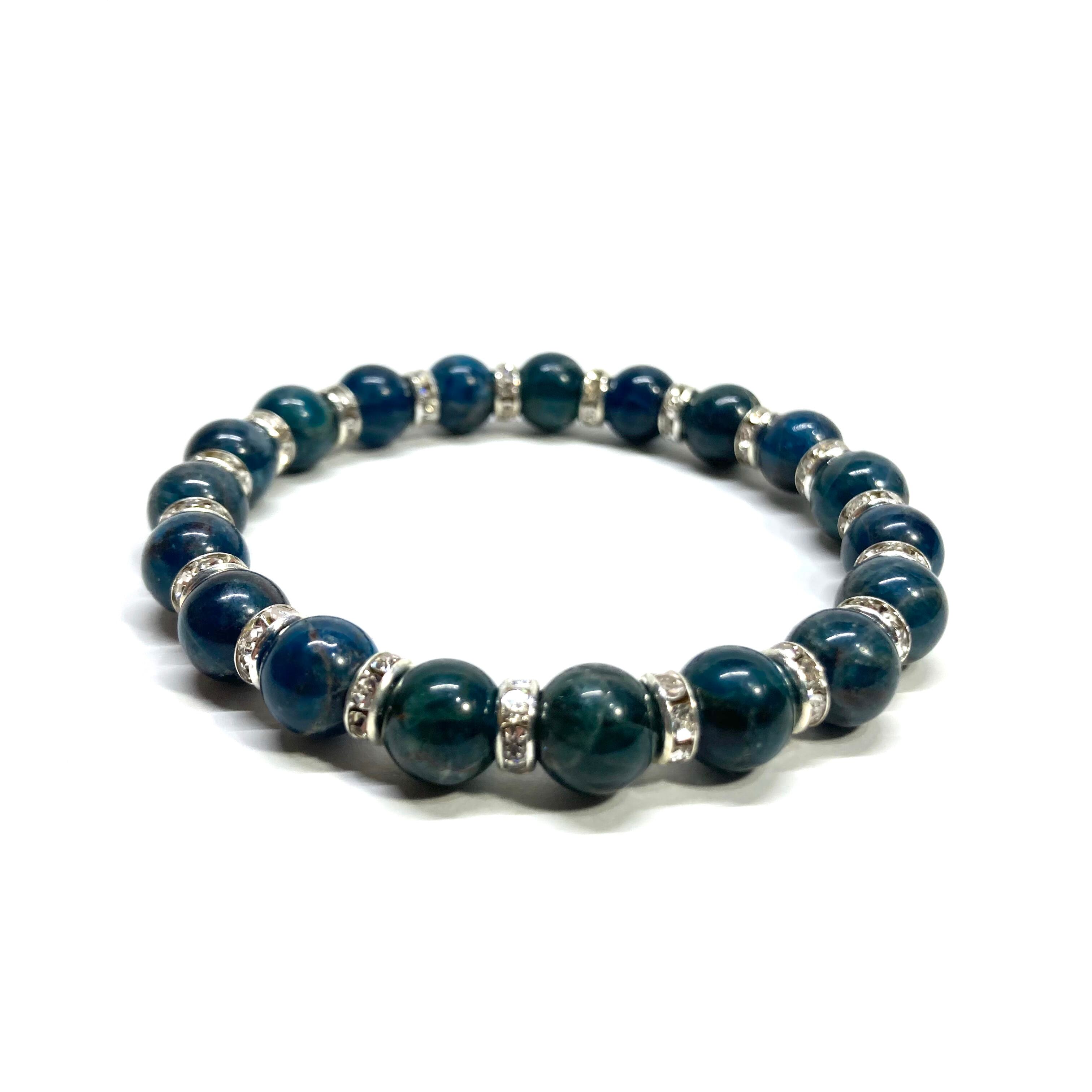 こちらは、アパタイトの8mm玉を使用したパワーストーンブレスレットです。石との間にはロンデルを挟み高級感を演出しております。シンプルなデザインは、シーン問わずどんなコーディネートとも合わせ易いブレスレットです。サイズは内周約17cm (手首周りを測り少し余裕をもってお買い求めくださいませ。)です。当社の中でも一番人気の実績があるデザインとなっております。気になる方はお早めにどうぞ。
