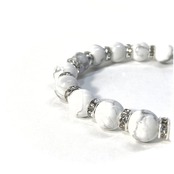 こちらは、ハウライトの8mm玉を使用したパワーストーンブレスレットです。石との間にはロンデルを挟み高級感を演出しております。シンプルなデザインは、シーン問わずどんなコーディネートとも合わせ易いブレスレットです。サイズは内周約17cm (手首周りを測り少し余裕をもってお買い求めくださいませ。)です。当社の中でも一番人気の実績があるデザインとなっております。気になる方はお早めにどうぞ。