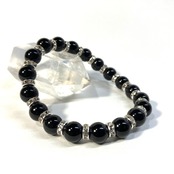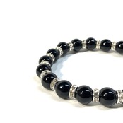 こちらは、オニキスの8mm玉を使用したパワーストーンブレスレットです。石との間にはロンデルを挟み高級感を演出しております。シンプルなデザインは、シーン問わずどんなコーディネートとも合わせ易いブレスレットです。サイズは内周約17cm (手首周りを測り少し余裕をもってお買い求めくださいませ。)です。当社の中でも一番人気の実績があるデザインとなっております。気になる方はお早めにどうぞ。