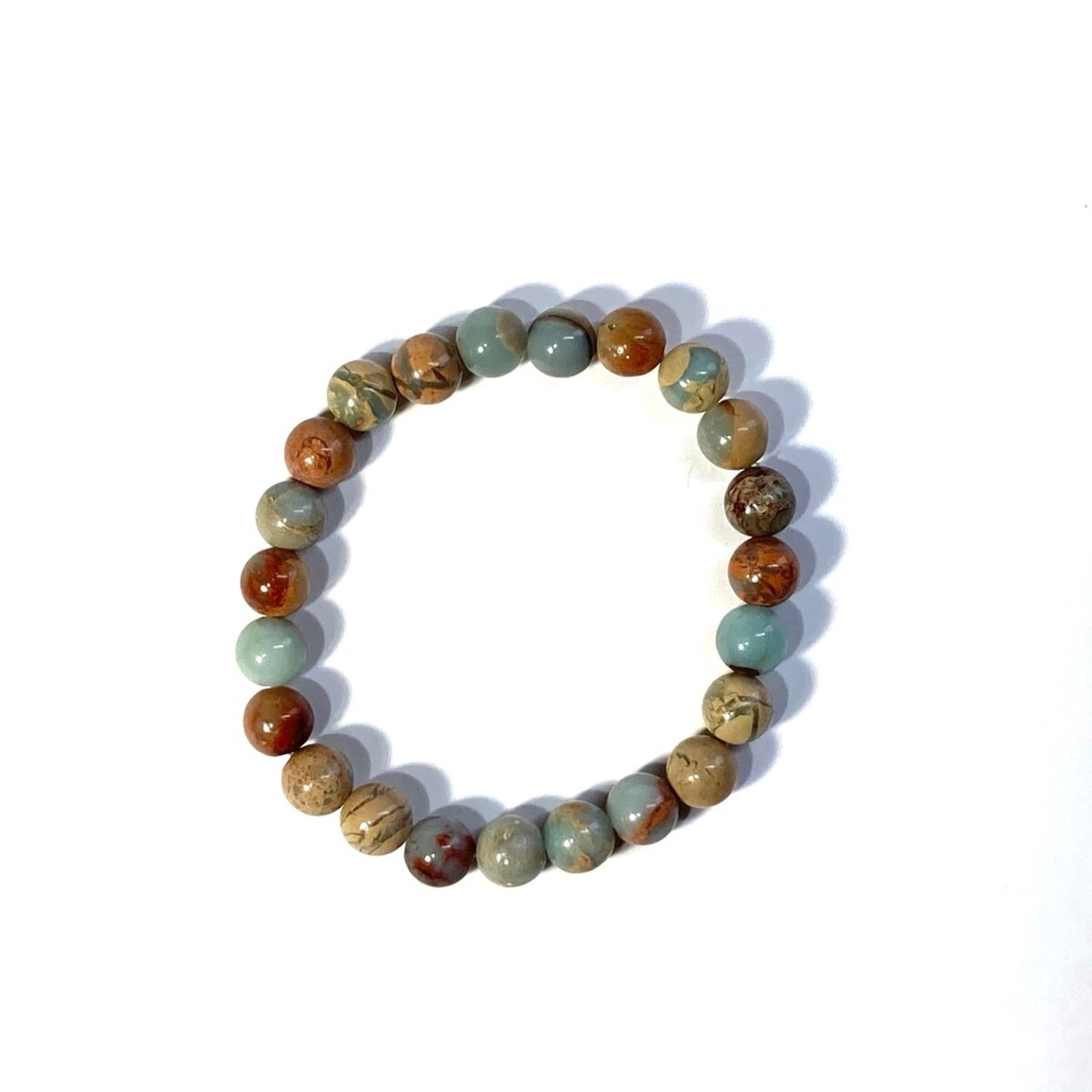 こちらは、インプレッションストーンの8mm玉を使用したパワーストーンブレスレットです。シンプルなデザインは、シーン問わずどんなコーディネートとも合わせ易いブレスレットです。内周 約16cmです。気になる方はお早めにどうぞ。