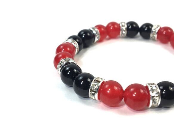 こちらは、8mm玉のジェイド(レッド)とオニキスを使用したパワーストーンブレスレットです。間にはロンデルを挟み高級感ある大人っぽいデザインに仕上がっています。サイズは内周約15cmです。気になる方は是非この機会にどうぞ。