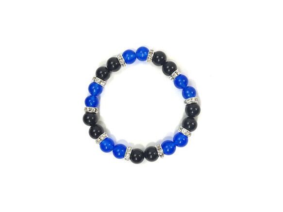 こちらは、8mm玉のジェイド(ブルー)とオニキスを使用したパワーストーンブレスレットです。間にはロンデルを挟み高級感ある大人っぽいデザインに仕上がっています。サイズは内周約15cmです。気になる方は是非この機会にどうぞ。