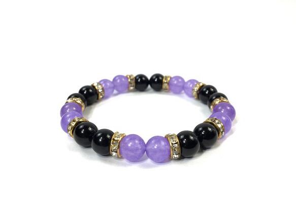 こちらは、8mm玉のジェイド(ラベンダーパープル)とオニキスを使用したパワーストーンブレスレットです。間にはロンデルを挟み高級感ある大人っぽいデザインに仕上がっています。サイズは内周約15cmです。気になる方は是非この機会にどうぞ。