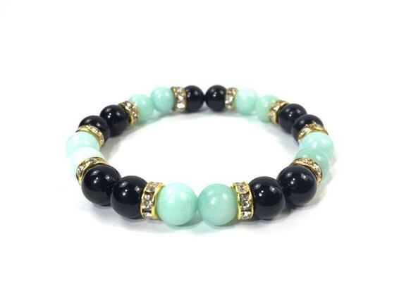 こちらは、8mm玉のジェイド(ブルーグリーン)とオニキスを使用したパワーストーンブレスレットです。間にはロンデルを挟み高級感ある大人っぽいデザインに仕上がっています。サイズは内周約15cmです。気になる方は是非この機会にどうぞ。