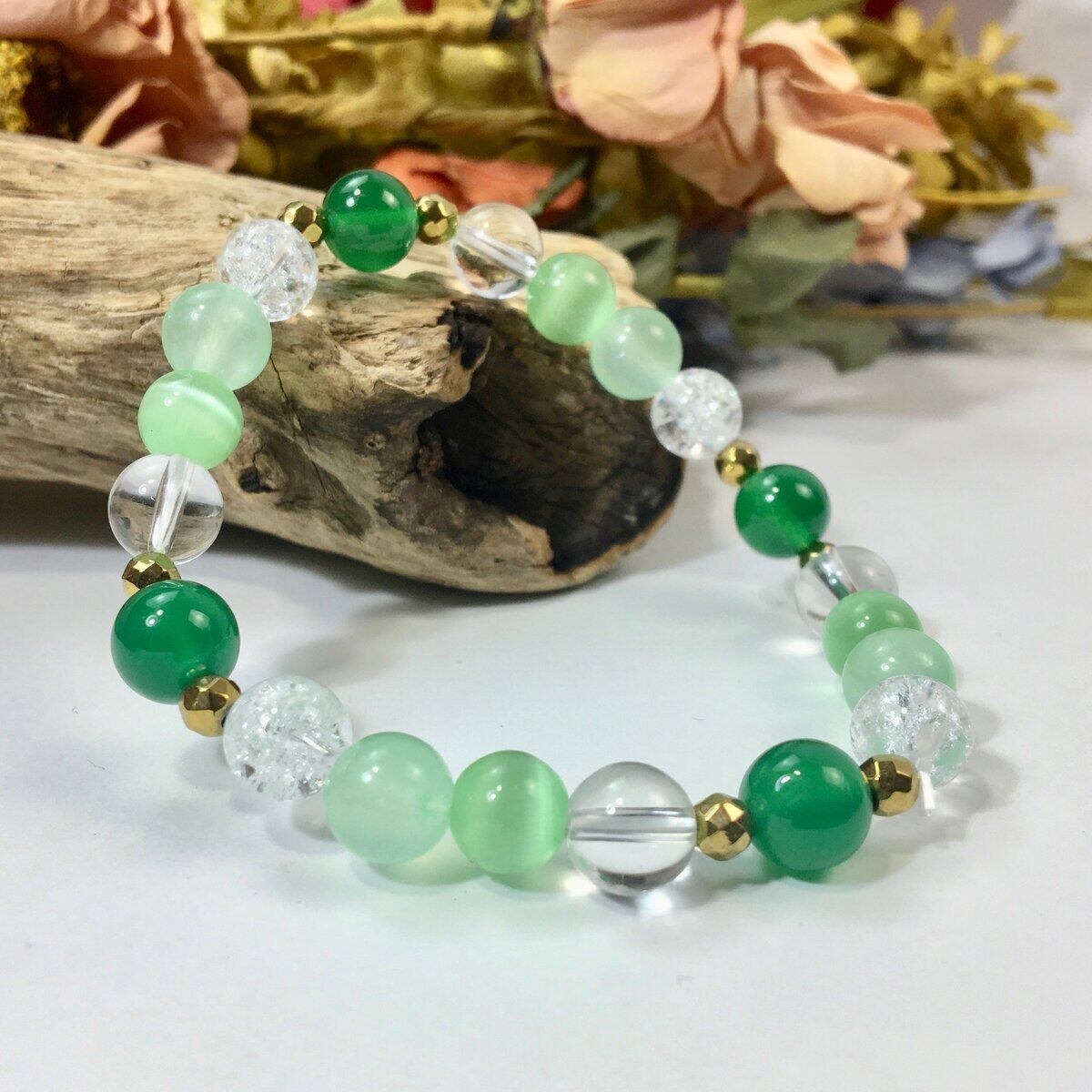 こちらは、8mm玉の緑瑪瑙、キャッツアイ、水晶、ジェイド、クラック水晶を使ったパワーストーンブレスレットです。今回は石との間にはゴールドのヘマタイトを加えアクセントとしております。今回は5種の石を使い可愛らしいデザインに仕上げています。サイズは内周 約16cm(手首周りを測り少し余裕をもってお買い求めくださいませ) 気になる方は是非この機会にどうぞ。
