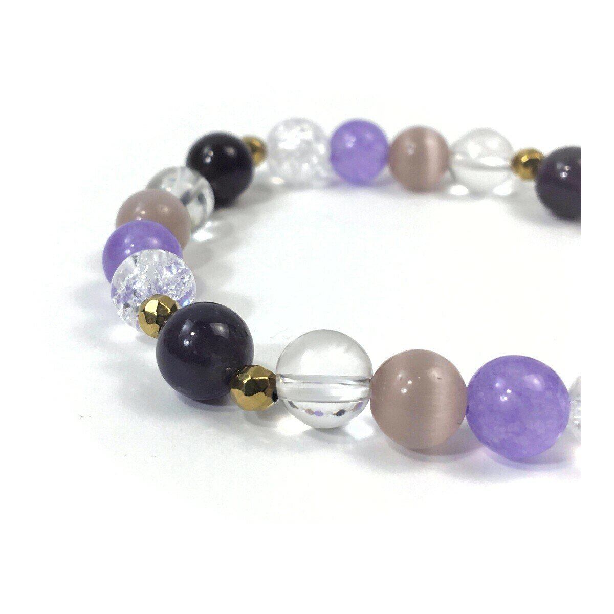 こちらは、8mm玉のアメジスト、キャッツアイ、水晶、ジェイド、クラック水晶を使ったパワーストーンブレスレットです。今回は石との間にはゴールドのヘマタイトを加えアクセントとしております。今回は5種の石を使い可愛らしいデザインに仕上げています。サイズは内周 約16cm(手首周りを測り少し余裕をもってお買い求めくださいませ) 気になる方は是非この機会にどうぞ。
