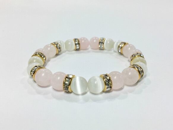 こちらは、8mm玉のホワイトキャッツアイとローズクォーツを使用したパワーストーンブレスレットです。間にはロンデルを挟み高級感ある大人っぽいデザインに仕上がっています。サイズは内周約15cmです。気になる方は是非この機会にどうぞ。