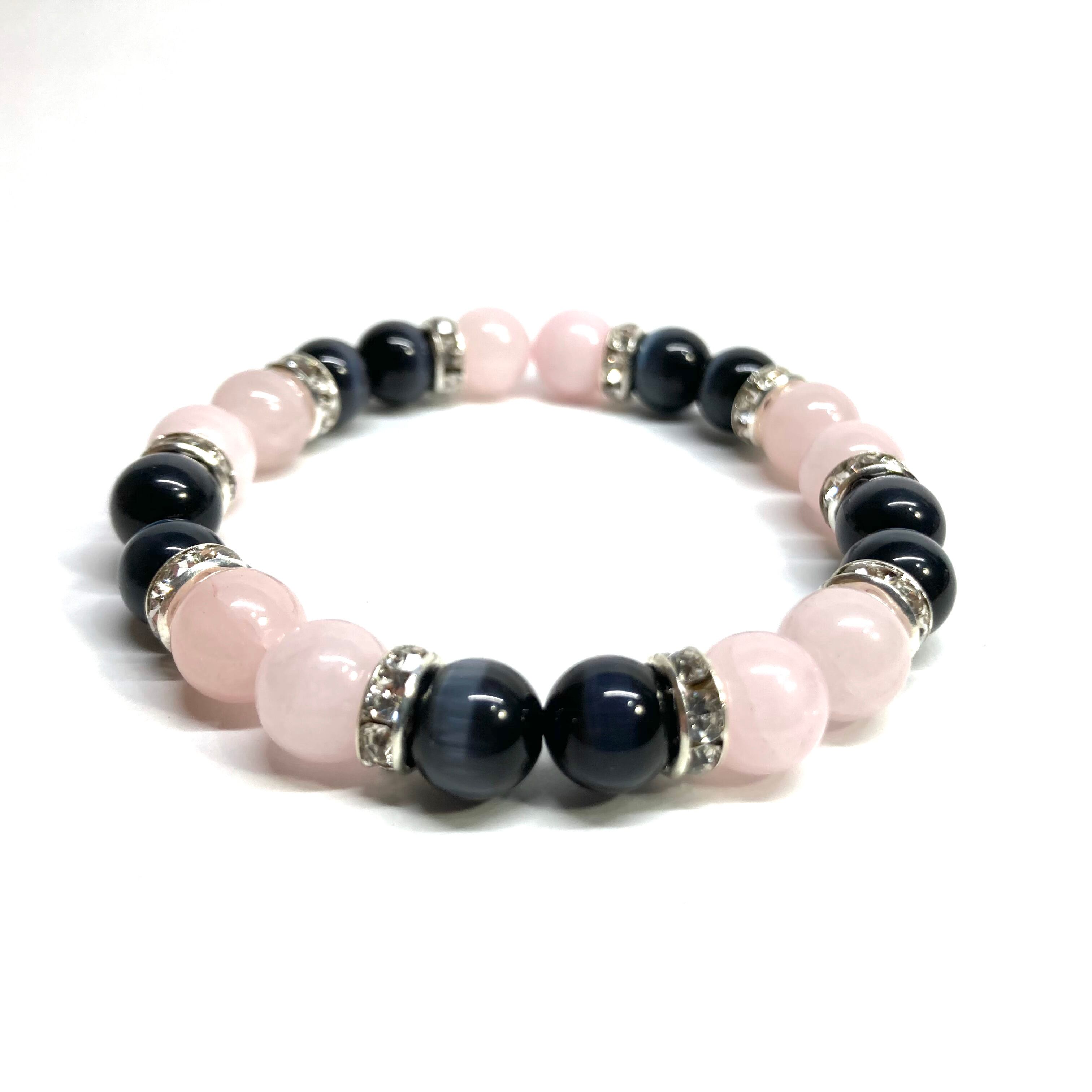 こちらは、8mm玉のブラックキャッツアイとローズクォーツを使用したパワーストーンブレスレットです。間にはシルバーのロンデルを挟み高級感ある大人っぽいデザインに仕上がっています。サイズは内周約15cmです。気になる方は是非この機会にどうぞ。