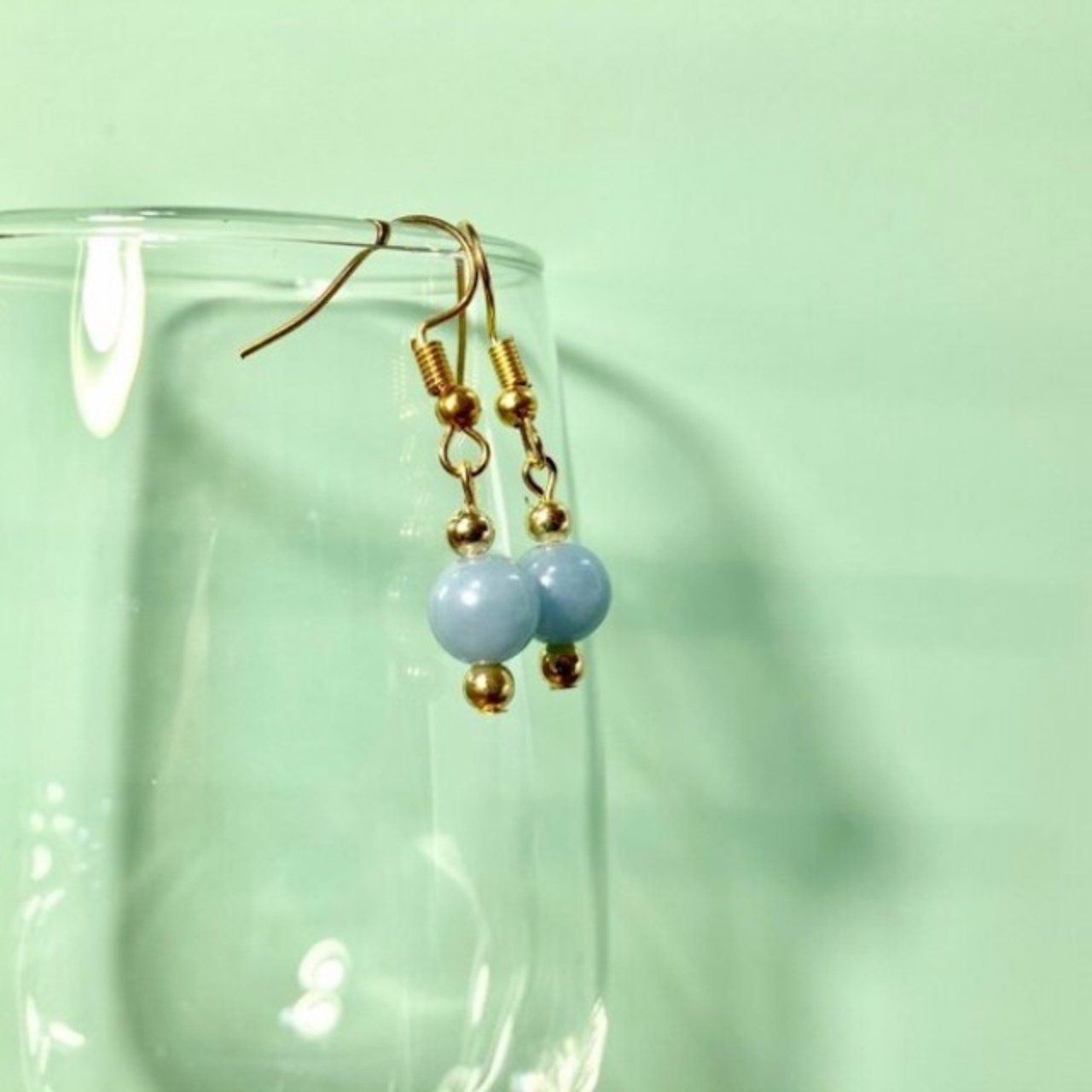 こちらは、8mm玉のエンジェライトを使用した一粒フックピアスです。シンプルなデザインはシーン問わず、どんなコーディネートにも合わせ易く使い勝手がいいアイテムです。今回は一粒ピアスの要望が多かった為制作しました。気になる方は是非この機会にどうぞ。