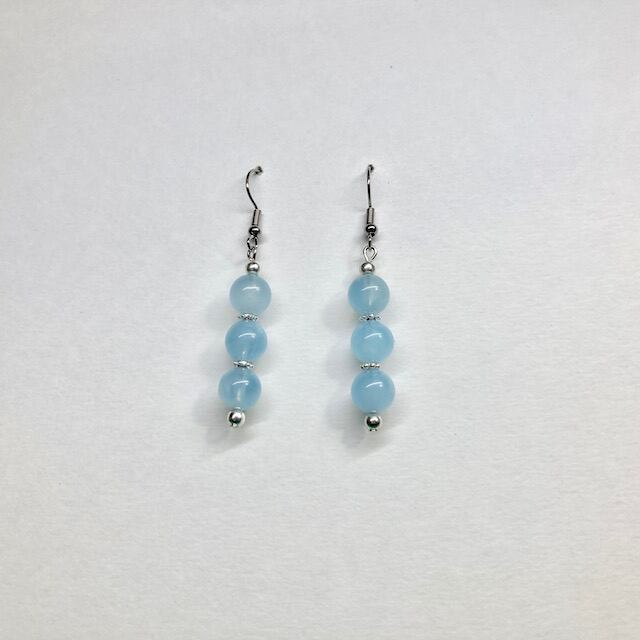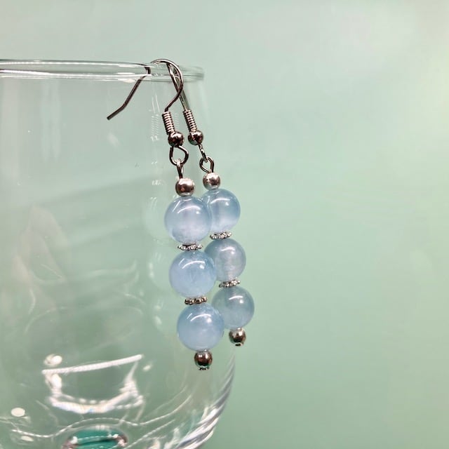 こちらは、8mm玉を使用したアクアマリンのフックピアスです。どんなコーディネートとも合わせやすい様にシンプルなデザインで制作。シンプルなデザインは飽きがこないのでシーズン問わず使える事間違い無しのアイテムです。上品な印象で耳元を華やかに飾ってくれるアイテムですので気になる方は是非この機会にどうぞ。