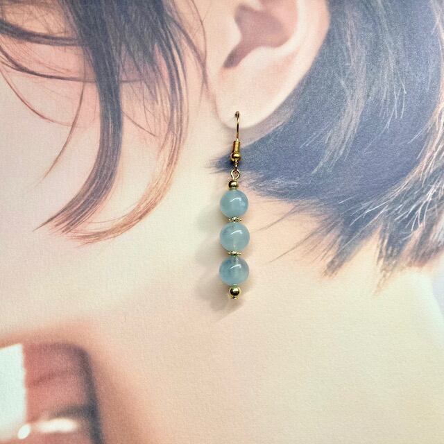 こちらは、8mm玉を使用したアクアマリンのフックピアスです。どんなコーディネートとも合わせやすい様にシンプルなデザインで制作。シンプルなデザインは飽きがこないのでシーズン問わず使える事間違い無しのアイテムです。上品な印象で耳元を華やかに飾ってくれるアイテムですので気になる方は是非この機会にどうぞ。