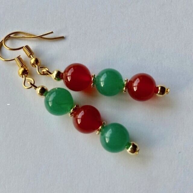 こちらは、8mm玉の赤瑪瑙とアベンチュリンを使用してフックピアス。今回はクリスマスを意識したレッドとグリーンのカラーリングでまとめたピアスです。右と左でデザインが違うアシンメトリーデザインを取り入れ遊び心もプラスしたアイテムとなっております。気になる方は是非この機会にどうぞ。