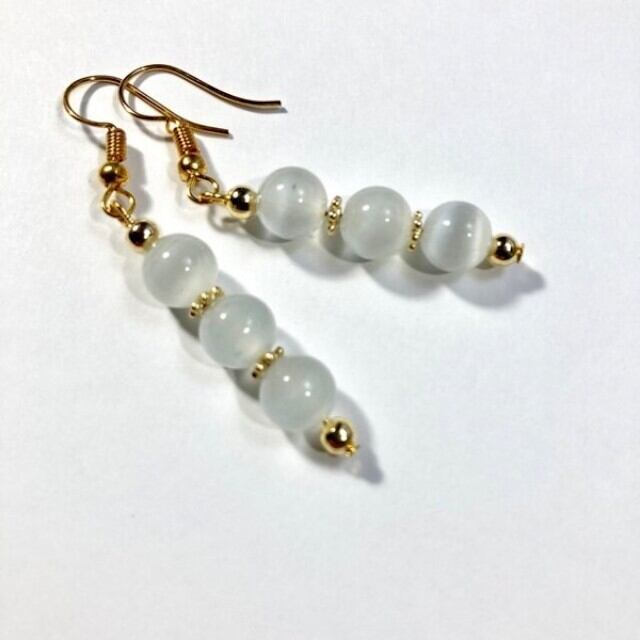 こちらは、8mm玉のキャッツアイを3個並べたフックピアスです。当ショップの中でも人気のあるキャッツアイは、女性の可愛らしさを引き立ててくれるピアスになっております。シンプルなデザインですのでコーディネートにも合わせやすいデザインで、使い勝手がいいアイテムとなっております。別売りのキャッツアイブレスレットと合わせても良さそうですね。気になる方は是非この機会にどうぞ。