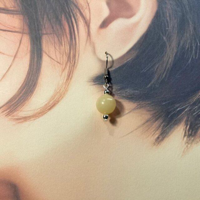 こちらは、10mm玉のアラゴナイトを使用した一粒フックピアスです。シンプルなデザインはシーン問わず、どんなコーディネートにも合わせ易く使い勝手がいいアイテムです。今回は一粒ピアスの要望が多かった為制作しました。気になる方は是非この機会にどうぞ。
