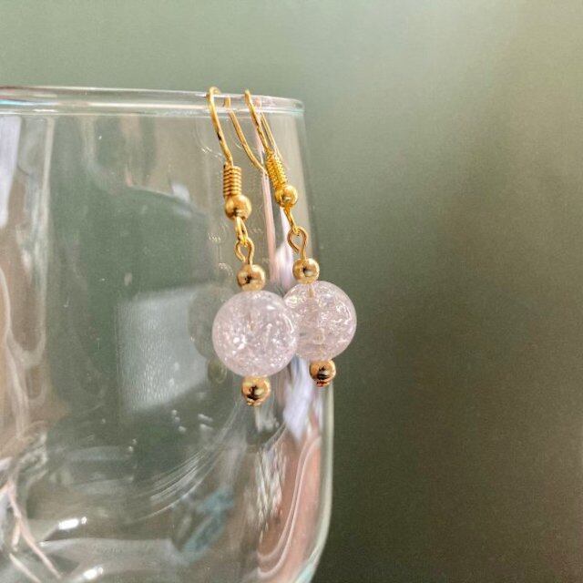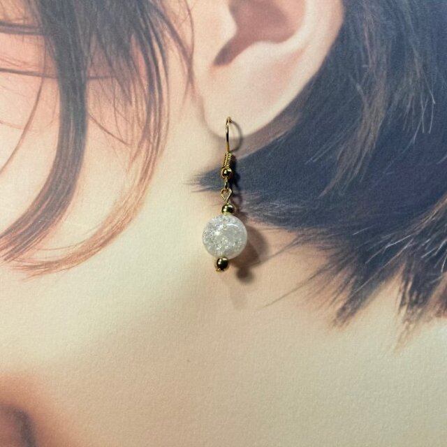 こちらは、10mm玉のクラック水晶を使用した一粒フックピアスです。シンプルなデザインはシーン問わず、どんなコーディネートにも合わせ易く使い勝手がいいアイテムです。今回は一粒ピアスの要望が多かった為制作しました。気になる方は是非この機会にどうぞ。