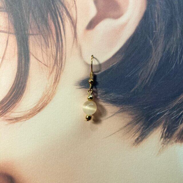 こちらは、8mm玉のキャッツアイを使用した一粒フックピアスです。シンプルなデザインはシーン問わず、どんなコーディネートにも合わせ易く使い勝手がいいアイテムです。今回は一粒ピアスの要望が多かった為制作しました。気になる方は是非この機会にどうぞ。